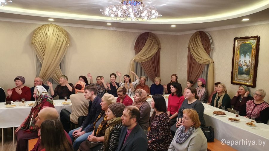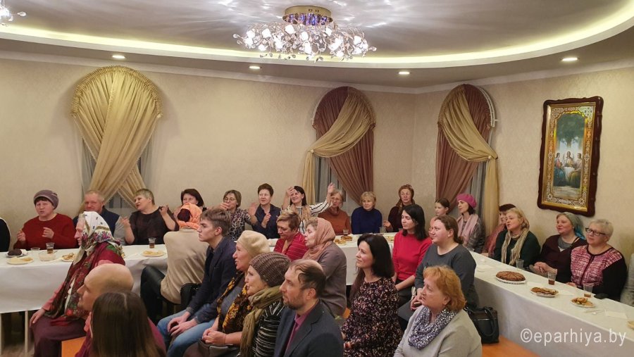 В воскресный вечер 1 марта 2020г. прихожане храма Преображения Господня в г. Гомеле собрались на службу, чтобы попросить прощения друг у друга и получить благословение на Великий пост. После богослужения никто не торопился расходиться по домам, а продолжили вечер за горячим чаем с блинами. Настоятель прихода протоиерей Олег Кострома еще раз напомнил всем собравшимся о важности прощения и покаяния и о том, как с пользой для души провести Великий пост, а также рассказал о юбилейных датах Гомельской епархии. В рамках празднования юбилея епархии почетным гостем вечера стала лауреат премии президента Республики Беларусь «За духовное возрождение», народная артистка Беларуси, ведущий мастер сцены Галина Павленок. Принимая во внимание, что 2020 год Русской Православной Церковью ознаменован памятной датой посвященной 75-летию Победы в Великой Отечественной войне «Великая Победа: наследие и наследники», Галина Ивановна исполнила старинные романсы, а также песни военных лет. |