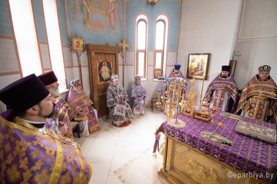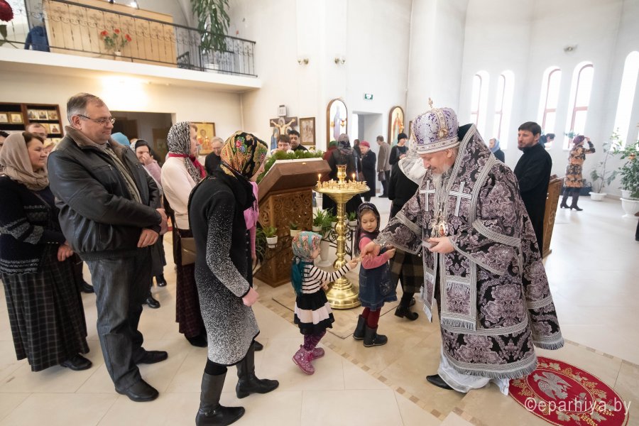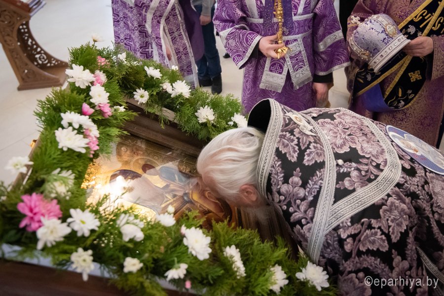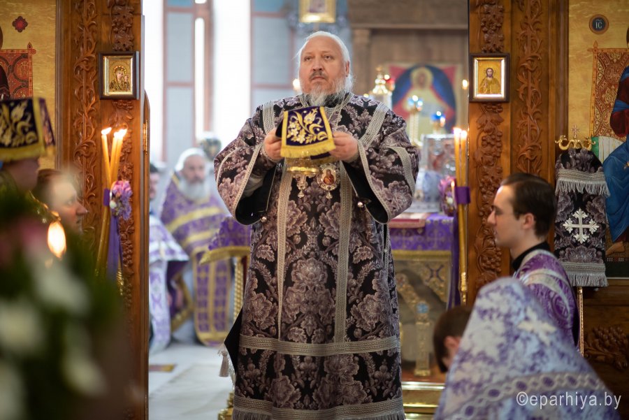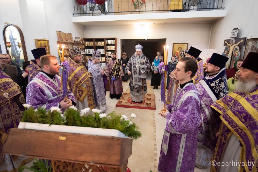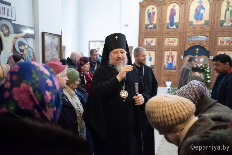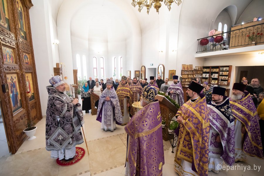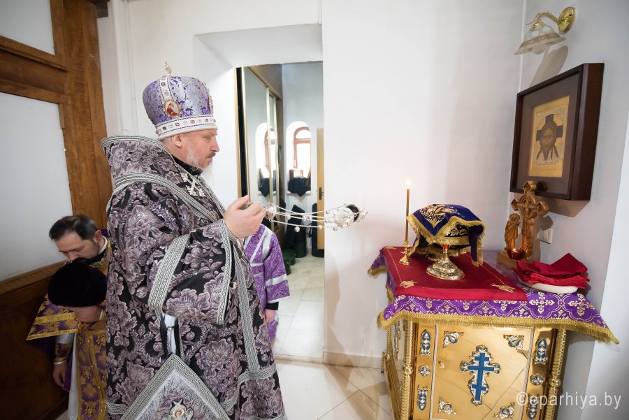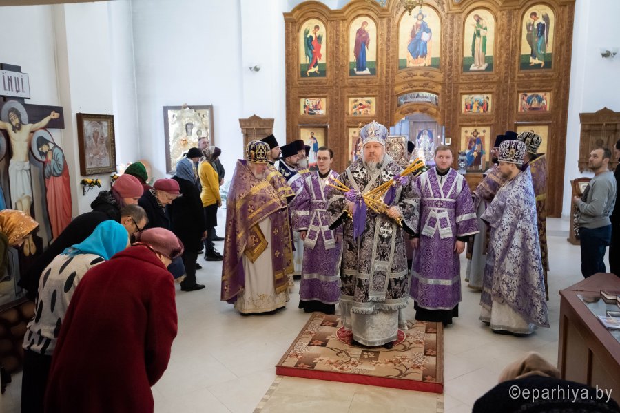 В среду первой седмицы Великого поста, 4 марта 2020г., Высокопреосвященнейший Стефан, архиепископ Гомельский и Жлобинский совершил Божественную литургию Преждеосвященных Даров в храме Грузинской иконы Божией Матери г.Гомеля, где находится одноименный старинный образ Богородицы. Высокопреосвященнейшему сослужили: секретарь Гомельской епархии протоиерей Георгий Алампиев, председатель отдела архитектуры и строительства Гомельской епархии протоиерей Георгий Тур, председатель отдела социального служения Гомельской епархии протоиерей Владимир Силенко, благочинный Гомельского городского округа протоиерей Игорь Ольшанов, благочинный Гомельского районного округа протоиерей Артемий Кривицкий, председатель Информационного отдела Гомельской епархии протоиерей Олег Кострома, настоятель прихода протоиерей Владимир Масалитин и духовенство епархии. По окончании литургии Владыка обратился к прихожанам со словами архипастырского назидания, в словах проповеди архиепископ напомнил, что решением Епархиального Совета Гомельской епархии от 2019г. 4 марта в приходе установлен как день обретения иконы Божией Матери «Грузинская». Святой образ, написанный в 19 веке, ранее находился в одном из храмов г. Гомеля и был спасен от уничтожения после революции 1917г. Более 30 лет назад Воронин Николай Илларионович приобрел икону в деревне Поддобрянка Гомельского района и 4 марта 2019г. святой образ был торжественно передан в одноименный храм г.Гомеля, на свою историческую родину. |