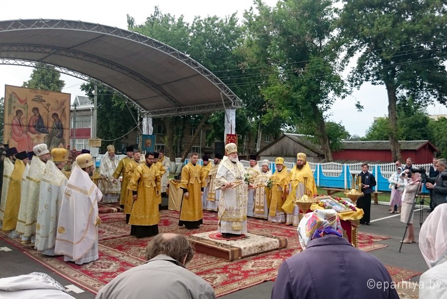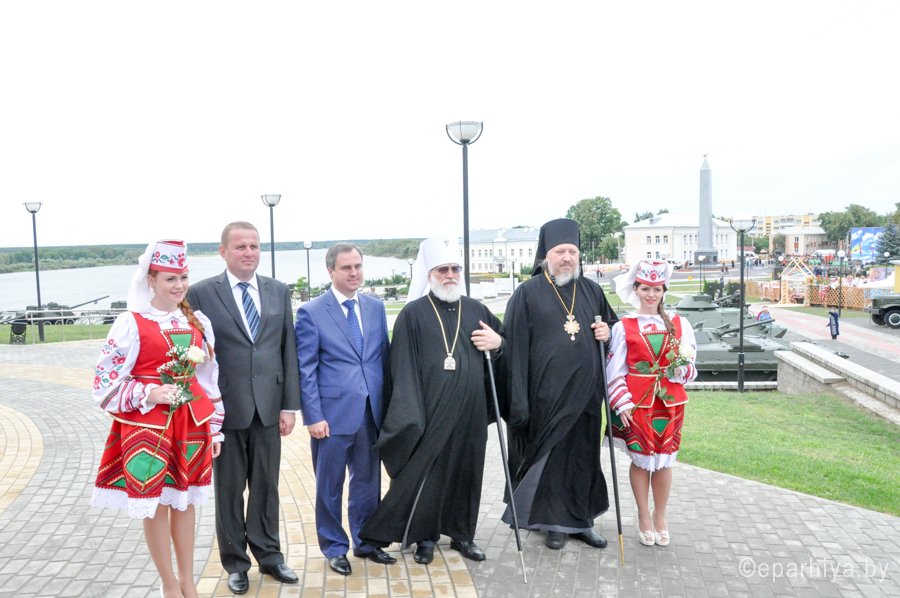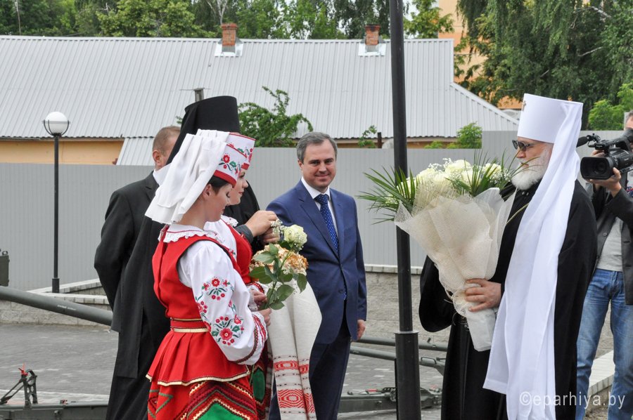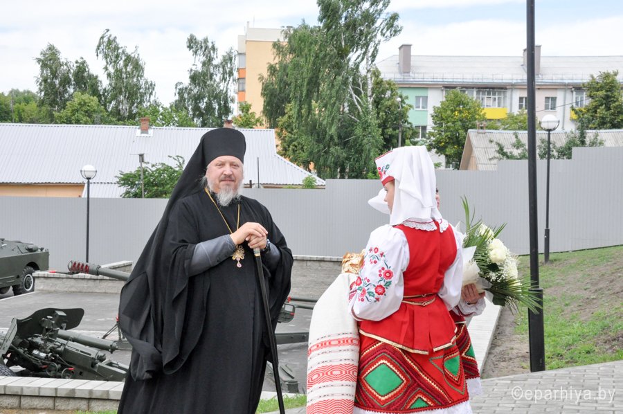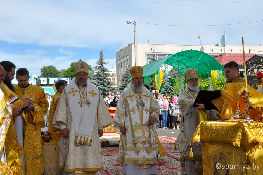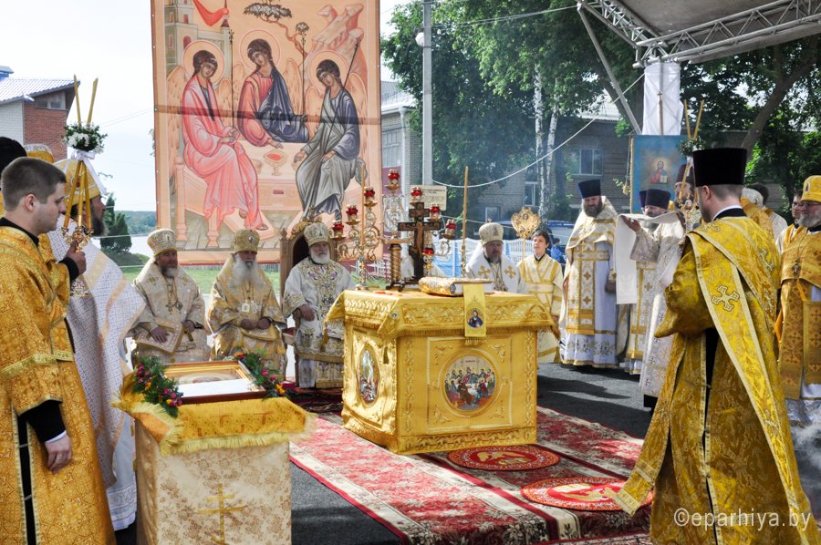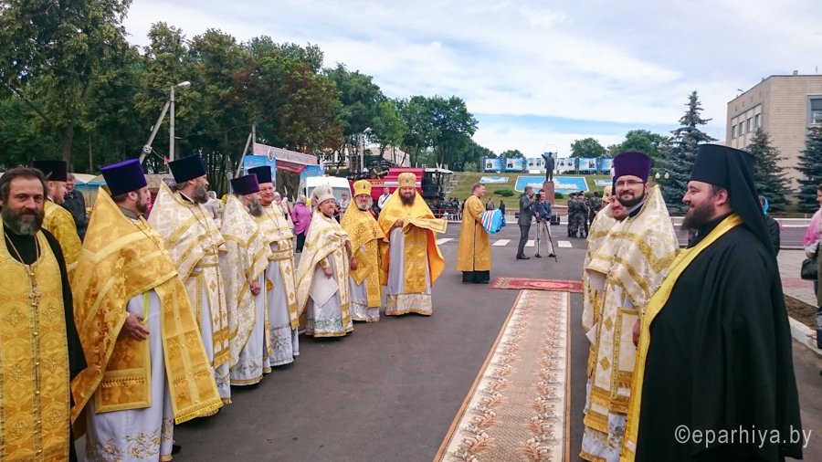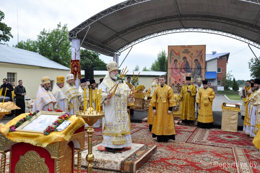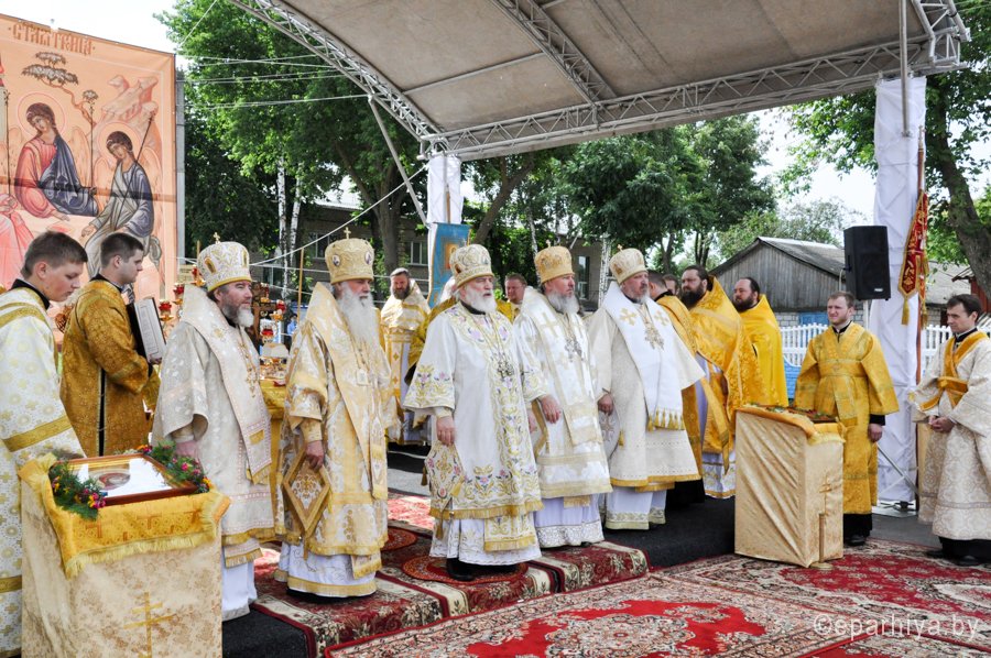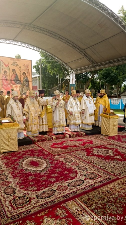 27 июня 2015г. в центре г/п Лоев под переливчатый звон колоколов передвижной звонницы Спасо-Преображенского храма г.Гомеля духовенство и молящиеся встретили своего Архипастыря — Высокопреосвященнейшего Павла, митрополита Минского и Заславского, Патриаршего Экзарха всея Беларуси. Божественной литургией начались торжества по случаю Дня единения славян и великой даты — 70-летия Победы в Великой Отечественной войне. Богослужение совершили Высокопреосвященнейший Павел митрополит Минский и Заславский, Патриарший Экзарх всея Беларуси, митрополит Брянский и Севский Александр, архиепископ Черниговский и Новгород-Северский Амвросий, епископ Гомельский и Жлобинский Стефан, епископ Туровский и Мозырский Леонид в сослужении духовенства братских народов. На богослужении присутствовали:: председатель Гомельского областного исполнительного комитета Владимир Андреевич Дворник; и.о. губернатора Брянской области Александр Васильевич Богомаз; советник председателя Черниговской областной государственной администрации Константин Викторович Иванов; председатель Лоевского районного исполнительного комитета Сергей Анатольевич Ткачук, руководители промышленной и сельско-хозяйственной отраслей. За богослужением Патриарший Экзарх всея Беларуси вознес молитву о мире на Украине. Проповедь перед Причастием произнес настоятель храма в честь святого мученика Иоанна Воина города Жлобина иеромонах Кронид (Печевистый). Богослужебные песнопения исполнил хор прихода храма Иконы Божией Матери "Иверская" г.Гомеля под управлением Лии Сычевой. По отпусте Божественной литургии Патриарший Экзарх обратился ко всем собравшимся со словом назидания, в котором подчеркнул ценность братского единства. «Единство — это особый дар Божий. В единении мы сильны и крепки. В единении нашем будет ниспосылаться благословение Божие людям, и люди будут жить в мире и благополучии», — сказал митрополит Павел. Владыка Экзарх выразил сердечную благодарность представителям государственной власти, архиереям, духовенству и благочестивым мирянам. Митрополит Павел поздравил причастников с принятием Святых Христовых Таин и преподал всем архипастырское благословение. Верующим были розданы иконки Святой Троицы с благословением Патриаршего Экзарха. После торжественного богослужения на главной площади Лоева состоялся праздничный концерт. Празднование Дня единения славян - это одно из крупнейших международных мероприятий, которое начало свою историю в 1969 году и проходило как встреча делегаций приграничных областей - Гомельской, Брянской и Черниговской. В августе 1975 года, в год 30-летия Победы в Великой Отечественной войне 1941-1945 годов, на месте пересечения границ Беларуси, Украины и России был воздвигнут Монумент дружбы «Три сестры». В 2001 году братский фестиваль почтил своим присутствием Святейший Патриарх Московский и всея Руси Алексий II, в 2004 – президенты трёх стран. Владимир Дворник, обращаясь к присутствующим отметил: «В год празднования 70-летия Победы над немецко-фашистских захватчиков местом проведения торжеств был выбран г.п. Лоев не случайно. Именно здесь на берегах Днепра осенью 1943 года сошлись в боях 4 миллиона солдат и офицеров. Более 10 тысяч бойцов навсегда остались лежать в этой земле. Как вспоминают очевидцы тех событий: «Днепр был кирпично–красн