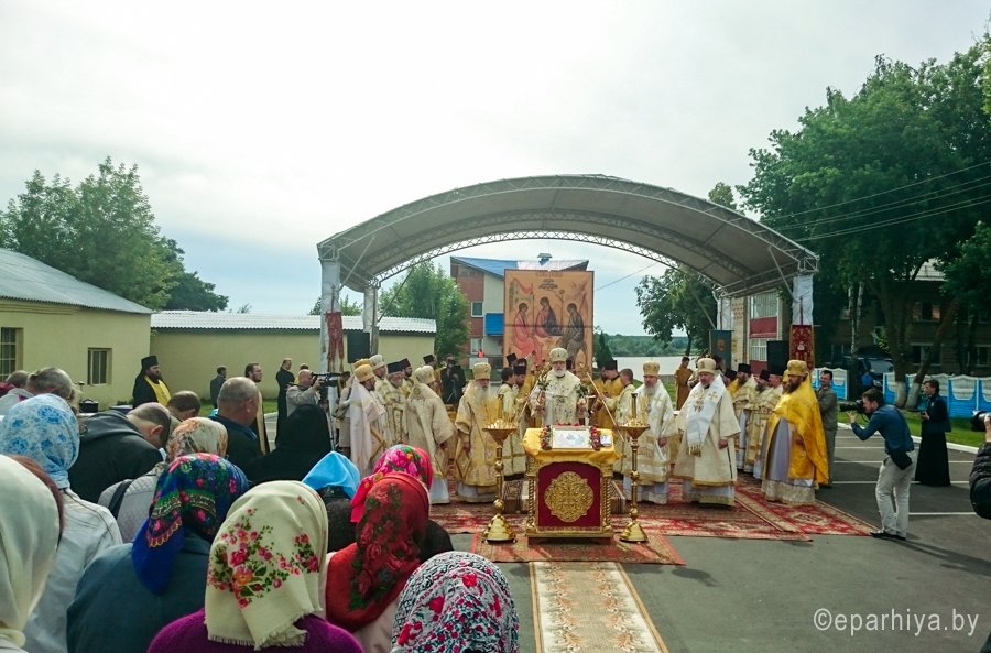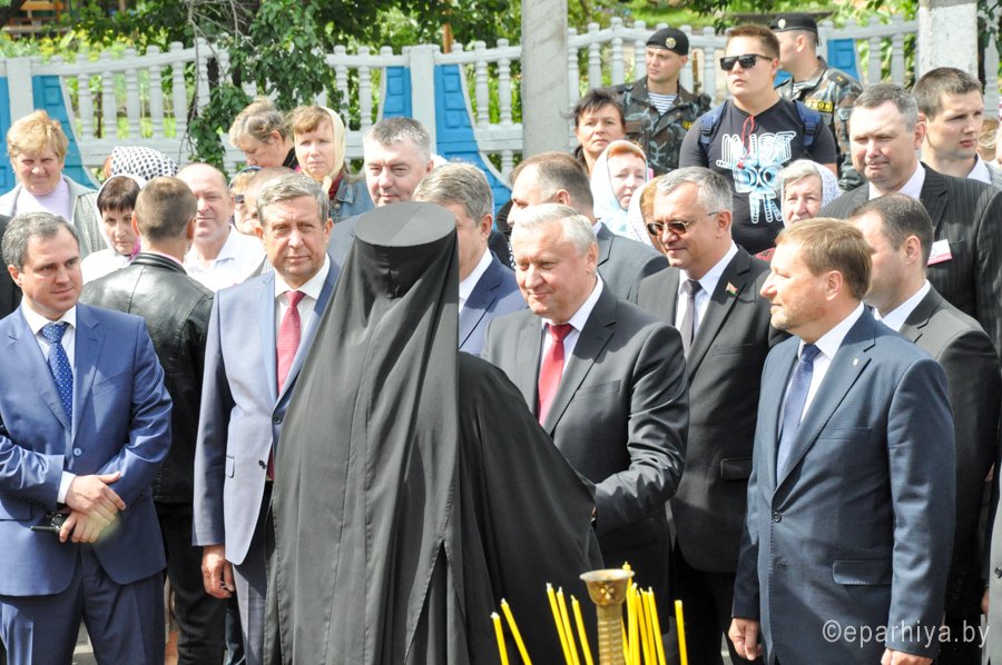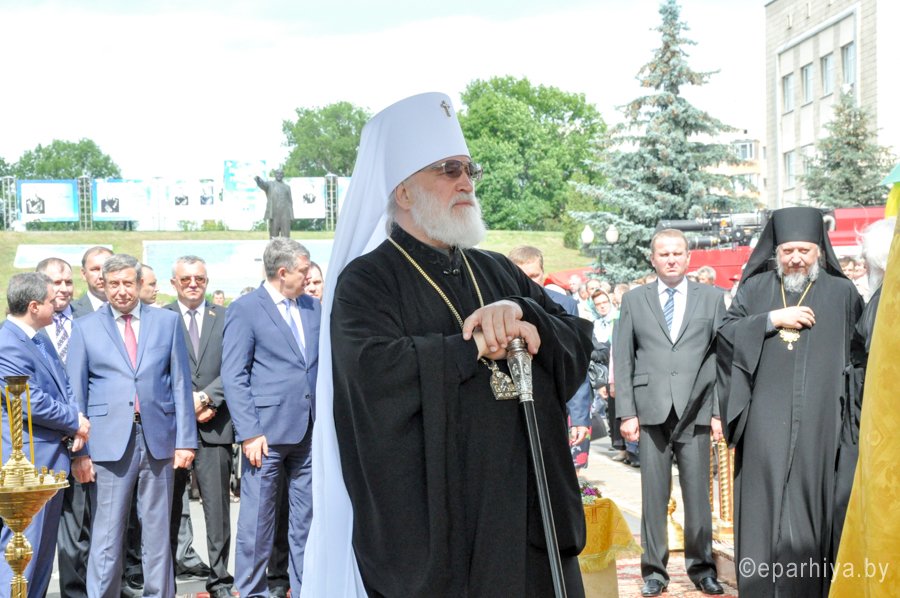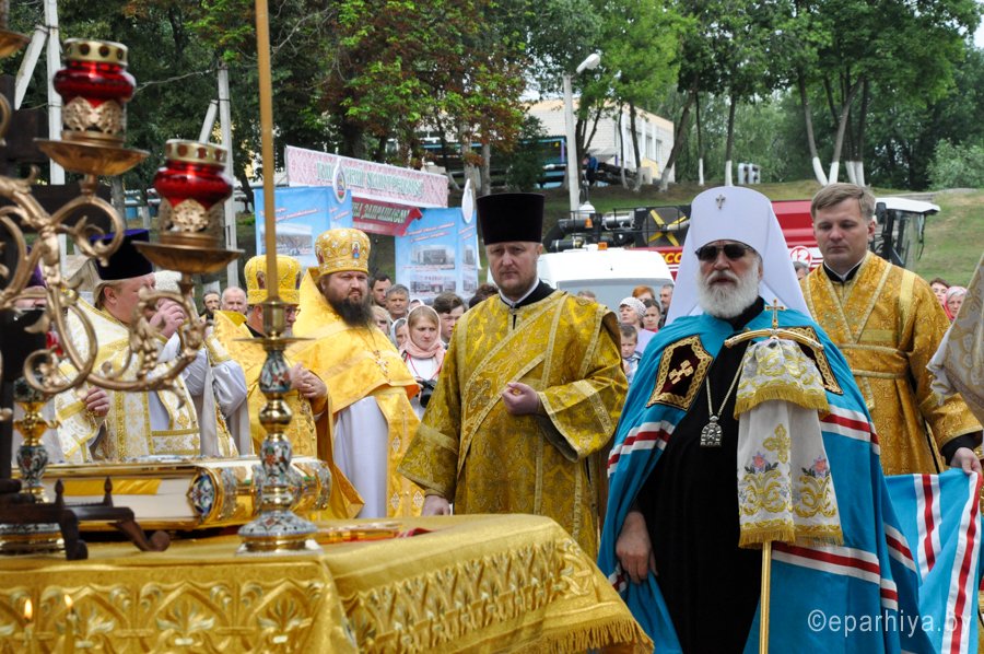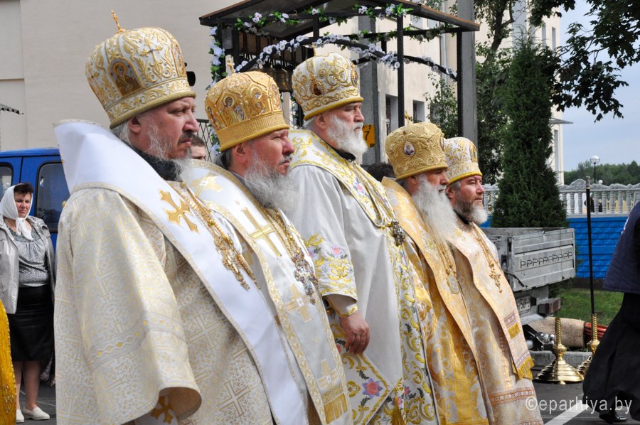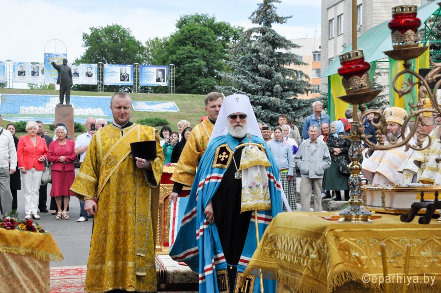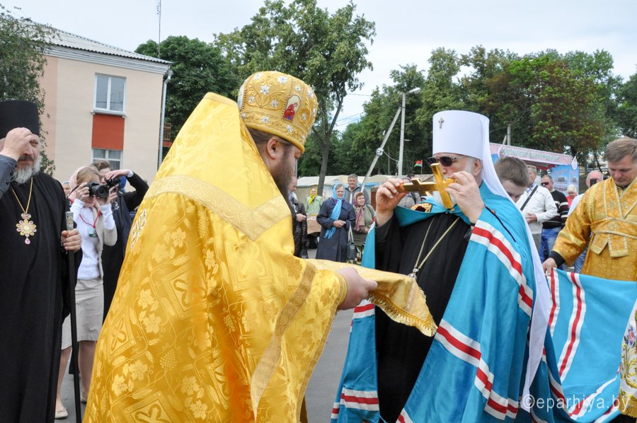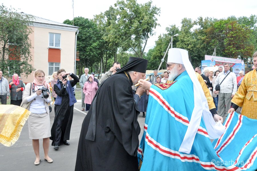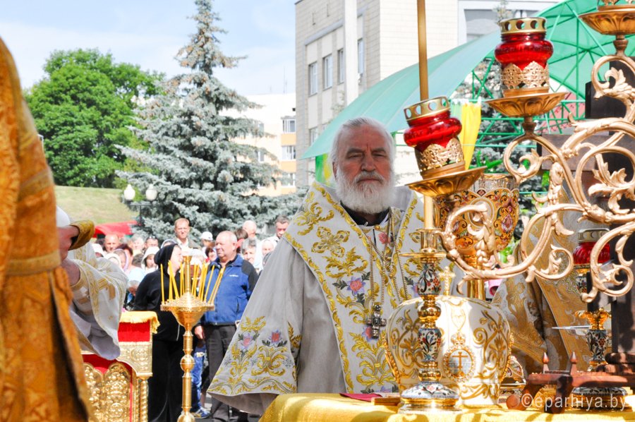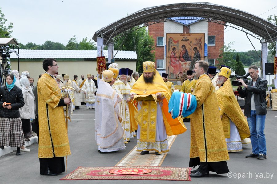 27 июня 2015г. в центре г/п Лоев под переливчатый звон колоколов передвижной звонницы Спасо-Преображенского храма г.Гомеля духовенство и молящиеся встретили своего Архипастыря — Высокопреосвященнейшего Павла, митрополита Минского и Заславского, Патриаршего Экзарха всея Беларуси. Божественной литургией начались торжества по случаю Дня единения славян и великой даты — 70-летия Победы в Великой Отечественной войне. Богослужение совершили Высокопреосвященнейший Павел митрополит Минский и Заславский, Патриарший Экзарх всея Беларуси, митрополит Брянский и Севский Александр, архиепископ Черниговский и Новгород-Северский Амвросий, епископ Гомельский и Жлобинский Стефан, епископ Туровский и Мозырский Леонид в сослужении духовенства братских народов. На богослужении присутствовали:: председатель Гомельского областного исполнительного комитета Владимир Андреевич Дворник; и.о. губернатора Брянской области Александр Васильевич Богомаз; советник председателя Черниговской областной государственной администрации Константин Викторович Иванов; председатель Лоевского районного исполнительного комитета Сергей Анатольевич Ткачук, руководители промышленной и сельско-хозяйственной отраслей. За богослужением Патриарший Экзарх всея Беларуси вознес молитву о мире на Украине. Проповедь перед Причастием произнес настоятель храма в честь святого мученика Иоанна Воина города Жлобина иеромонах Кронид (Печевистый). Богослужебные песнопения исполнил хор прихода храма Иконы Божией Матери "Иверская" г.Гомеля под управлением Лии Сычевой. По отпусте Божественной литургии Патриарший Экзарх обратился ко всем собравшимся со словом назидания, в котором подчеркнул ценность братского единства. «Единство — это особый дар Божий. В единении мы сильны и крепки. В единении нашем будет ниспосылаться благословение Божие людям, и люди будут жить в мире и благополучии», — сказал митрополит Павел. Владыка Экзарх выразил сердечную благодарность представителям государственной власти, архиереям, духовенству и благочестивым мирянам. Митрополит Павел поздравил причастников с принятием Святых Христовых Таин и преподал всем архипастырское благословение. Верующим были розданы иконки Святой Троицы с благословением Патриаршего Экзарха. После торжественного богослужения на главной площади Лоева состоялся праздничный концерт. Празднование Дня единения славян - это одно из крупнейших международных мероприятий, которое начало свою историю в 1969 году и проходило как встреча делегаций приграничных областей - Гомельской, Брянской и Черниговской. В августе 1975 года, в год 30-летия Победы в Великой Отечественной войне 1941-1945 годов, на месте пересечения границ Беларуси, Украины и России был воздвигнут Монумент дружбы «Три сестры». В 2001 году братский фестиваль почтил своим присутствием Святейший Патриарх Московский и всея Руси Алексий II, в 2004 – президенты трёх стран. Владимир Дворник, обращаясь к присутствующим отметил: «В год празднования 70-летия Победы над немецко-фашистских захватчиков местом проведения торжеств был выбран г.п. Лоев не случайно. Именно здесь на берегах Днепра осенью 1943 года сошлись в боях 4 миллиона солдат и офицеров. Более 10 тысяч бойцов навсегда остались лежать в этой земле. Как вспоминают очевидцы тех событий: «Днепр был кирпично–красн