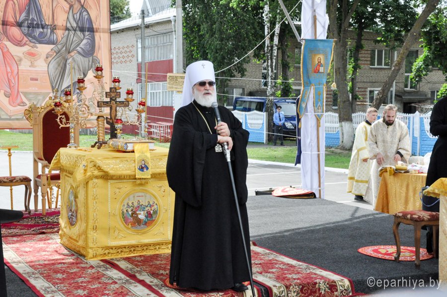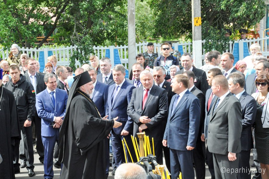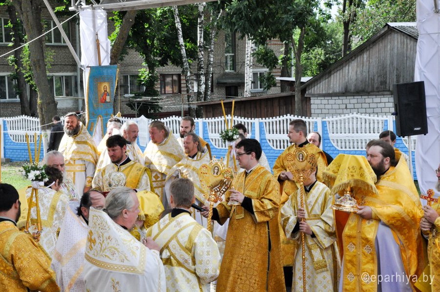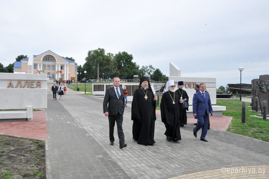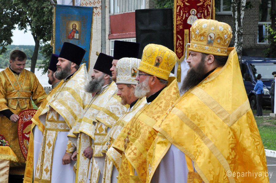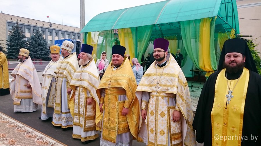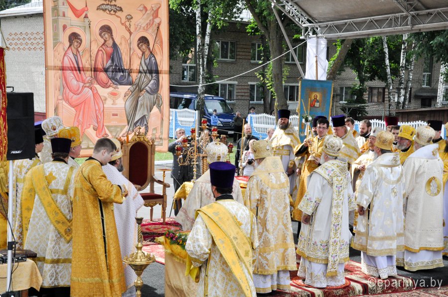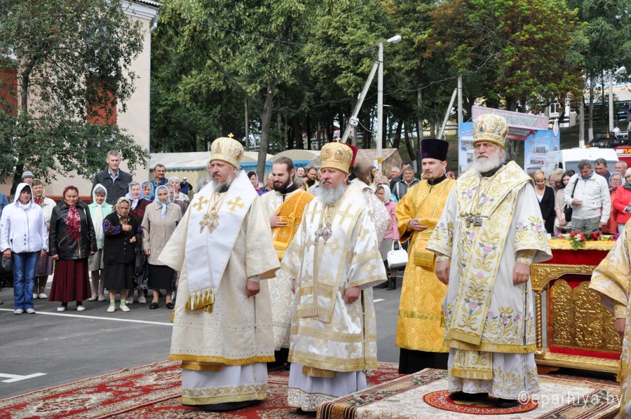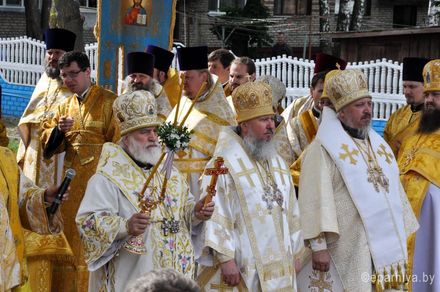27 июня 2015г. в центре г/п Лоев под переливчатый звон колоколов передвижной звонницы Спасо-Преображенского храма г.Гомеля духовенство и молящиеся встретили своего Архипастыря — Высокопреосвященнейшего Павла, митрополита Минского и Заславского, Патриаршего Экзарха всея Беларуси. Божественной литургией начались торжества по случаю Дня единения славян и великой даты — 70-летия Победы в Великой Отечественной войне. Богослужение совершили Высокопреосвященнейший Павел митрополит Минский и Заславский, Патриарший Экзарх всея Беларуси, митрополит Брянский и Севский Александр, архиепископ Черниговский и Новгород-Северский Амвросий, епископ Гомельский и Жлобинский Стефан, епископ Туровский и Мозырский Леонид в сослужении духовенства братских народов. На богослужении присутствовали:: председатель Гомельского областного исполнительного комитета Владимир Андреевич Дворник; и.о. губернатора Брянской области Александр Васильевич Богомаз; советник председателя Черниговской областной государственной администрации Константин Викторович Иванов; председатель Лоевского районного исполнительного комитета Сергей Анатольевич Ткачук, руководители промышленной и сельско-хозяйственной отраслей. За богослужением Патриарший Экзарх всея Беларуси вознес молитву о мире на Украине. Проповедь перед Причастием произнес настоятель храма в честь святого мученика Иоанна Воина города Жлобина иеромонах Кронид (Печевистый). Богослужебные песнопения исполнил хор прихода храма Иконы Божией Матери "Иверская" г.Гомеля под управлением Лии Сычевой. По отпусте Божественной литургии Патриарший Экзарх обратился ко всем собравшимся со словом назидания, в котором подчеркнул ценность братского единства. «Единство — это особый дар Божий. В единении мы сильны и крепки. В единении нашем будет ниспосылаться благословение Божие людям, и люди будут жить в мире и благополучии», — сказал митрополит Павел. Владыка Экзарх выразил сердечную благодарность представителям государственной власти, архиереям, духовенству и благочестивым мирянам. Митрополит Павел поздравил причастников с принятием Святых Христовых Таин и преподал всем архипастырское благословение. Верующим были розданы иконки Святой Троицы с благословением Патриаршего Экзарха. После торжественного богослужения на главной площади Лоева состоялся праздничный концерт. Празднование Дня единения славян - это одно из крупнейших международных мероприятий, которое начало свою историю в 1969 году и проходило как встреча делегаций приграничных областей - Гомельской, Брянской и Черниговской. В августе 1975 года, в год 30-летия Победы в Великой Отечественной войне 1941-1945 годов, на месте пересечения границ Беларуси, Украины и России был воздвигнут Монумент дружбы «Три сестры». В 2001 году братский фестиваль почтил своим присутствием Святейший Патриарх Московский и всея Руси Алексий II, в 2004 – президенты трёх стран. Владимир Дворник, обращаясь к присутствующим отметил: «В год празднования 70-летия Победы над немецко-фашистских захватчиков местом проведения торжеств был выбран г.п. Лоев не случайно. Именно здесь на берегах Днепра осенью 1943 года сошлись в боях 4 миллиона солдат и офицеров. Более 10 тысяч бойцов навсегда остались лежать в этой земле. Как вспоминают очевидцы тех событий: «Днепр был кирпично–красн
