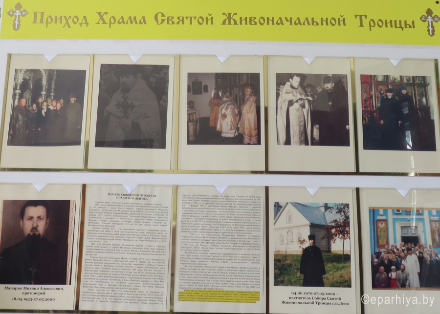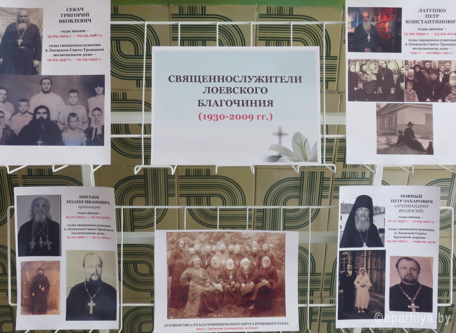 В истории каждой епархии, каждого храма есть периоды разрушений и репрессий, и периоды восстановления и созидания. Православные храмы Лоевщины в этом плане не исключения. В этом году Гомельская епархия отмечает ряд юбилейных дат. 2020 год для церковной жизни Лоевщины так же является знаковым: 30-летие со дня закладки 1 камня Свято-Троицкого храма протоиереем Михаилом Мандриком (третий день Святой Троицы – 5 июня 1990 года); 25-летие со дня первой Божественной Литургии в храме Покрова Пресвятой Богородицы д. Переделка (17 декабря 1995 года – по благословению Высокопреосвященнейшего Аристарха архиепископа Гомельского и Жлобинского совершена первая Божественная Литургия, которую возглавил протоиерей Андрей Белянко. Сослужил ему протодьякон Николай Приходько); 310 лет со дня явления иконы Святой Великомученицы Параскевы. Каждая знаковая дата – это возможность вспомнить конкретных людей, которые своим многолетним и усердным служением на благо Православной Церкви олицетворяют церковную жизнь на Лоевщине. В рамках юбилейных мероприятий Лоевским благочинием были организованы фотовыставки «История одного Храма» и «Священнослужители Лоевского благочиния (1930-2009)». Прихожане смогли увидеть архивные фото периода 1905 г., 1940-2009 гг, отражающие церковную жизнь на Лоевщине – строительство нового храма Святой Живоначальной Троицы г.п.Лоев, празднование явления иконы Великомученицы Параскевы-Пятницы на Лоевщине (Десятуха), история паломнических поездок. Большой интерес вызвала фотовыставка о священнослужителях, где представлена история жизни священников благочиния и архивные фото. Прихожане почтенного возраста с особой любовью вспоминают каждого священника – протоиерея Михаила Мандрика, архимандрита Феодосия (в миру Повный Петр Захарович), митрофорного протоиерея Иоанна (Мисеюк Иван Иванович), протоиерея Петра Латушко. На Лоевской земле некоторое время служил священномученик Иоанн (Пашин), епископ Рыльский. Накануне праздника Святой Троицы (Пятидесятницы) иерей Димитрий Чварков, настоятель прихода храма Святой Живоначальной Троицы г.п.Лоев посетил на дому прихожан почтенного возраста, которые многие годы усердно служили на благо Церкви Христовой, и поздравил их с юбилейными датами, вручив благодарственные грамоты, а так же подарил иконы Святой Троицы и подарки. В день престольного праздника – Святой Троицы настоятель Храма иерей Димитрий Чварков поздравил прихожан с юбилеем Храма и поблагодарил всех за понесенные труды в деле строительства Храма и сохранение и приумножение церковных традиций на Лоевской земле. В завершении церковного богослужения всем были розданы небольшие иконки Святой Троицы. Праздник завершился сладкими угощениями. |