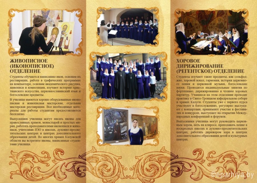 Калужское духовное училище по подготовке регентов и иконописцев, имея государственную аккредитацию и основываясь на требованиях Церковного образовательного стандарта, ведет обучение по образовательным программам следующих специальностей: "Живопись" с квалификацией "художник-живописец, преподаватель", "Иконописец, преподаватель"; "Хоровое дирижирование" с квалификацией "дирижер хора, преподаватель", "регент церковного хора, преподаватель" и по окончании выдает два диплома: государственный и церковный. Вся информация – на сайте Духовного училища: kdu-kaluga.ru |