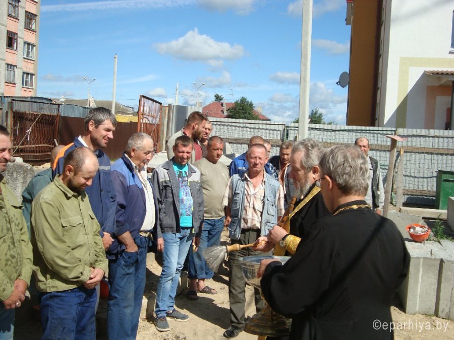 Настоятель прихода храма Преображения Господня в г. Ветке протоиерей Михаил Борисёнок 25 июля 2020г. совершил чин освящения места под строительство многоэтажного жилого дома в г. Ветке. Инициатором освящения выступил главный инженер СУ-165 (входящий в состав ОАО "Строительный трест № 14" г.Гомеля) Романишко Андрей Владимирович. Коллектив треста горячо поддержал идею и прекратил на время молебна строительные работы, чтобы совместно помолиться перед началом доброго дела. После завершения молебна, священнослужитель обратился к строителям со словами пастырского назидания, преподал им благословение и окропил святой водой. |