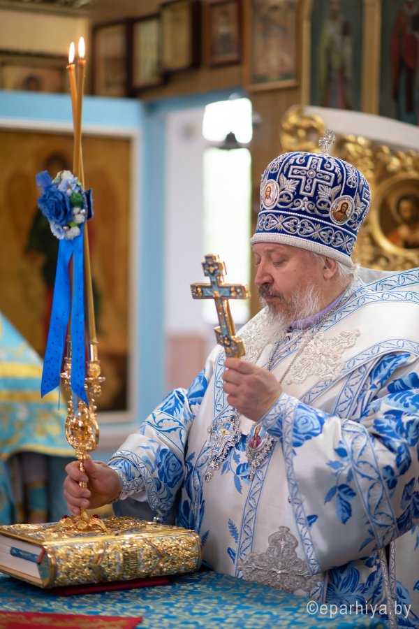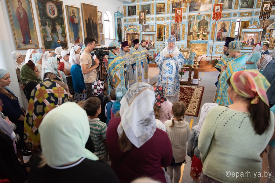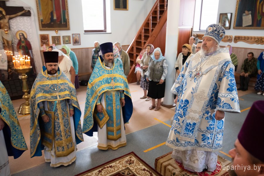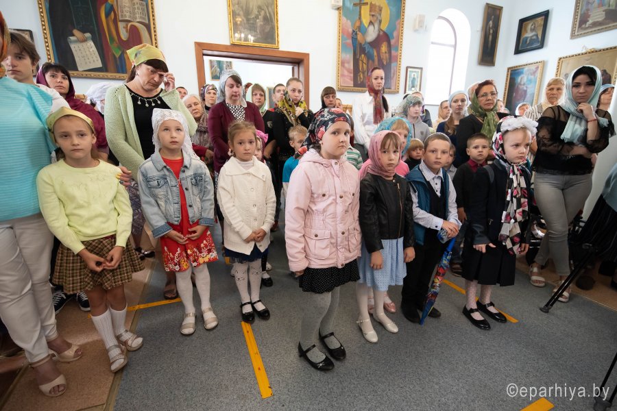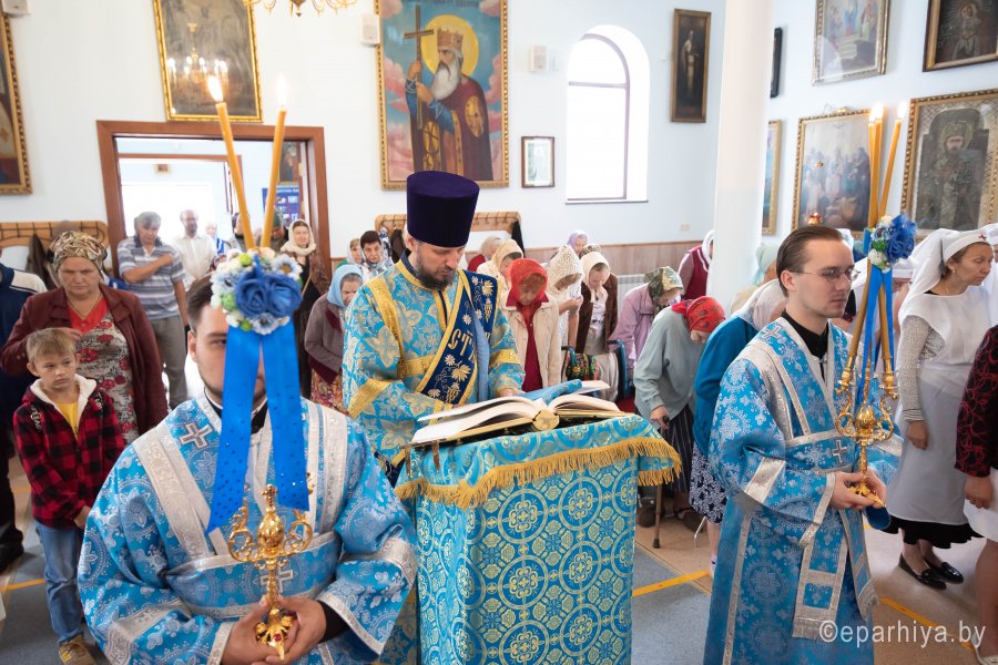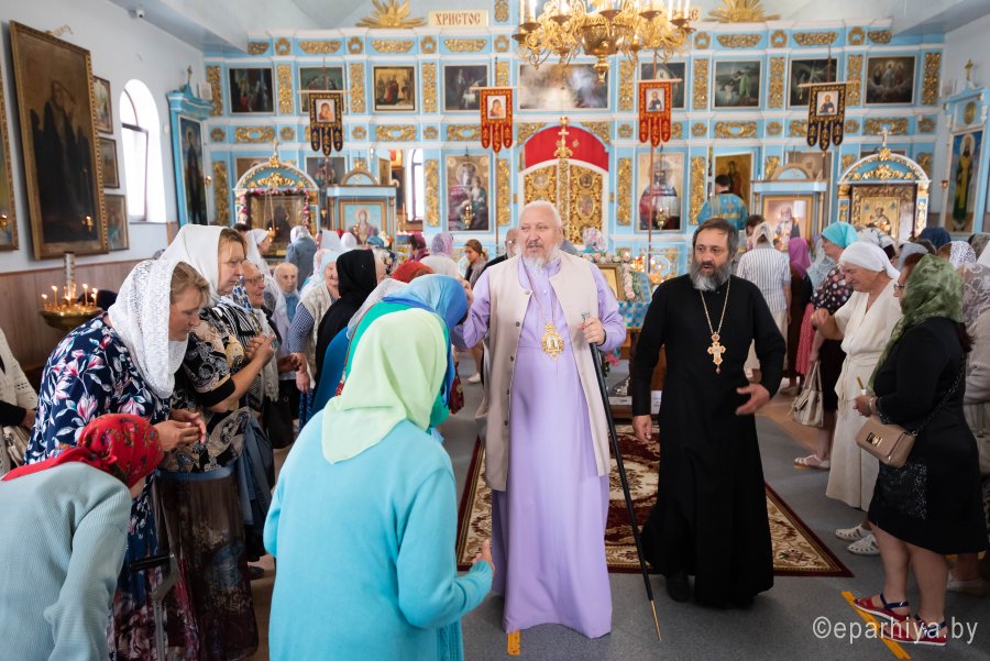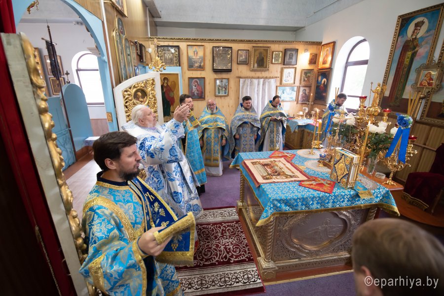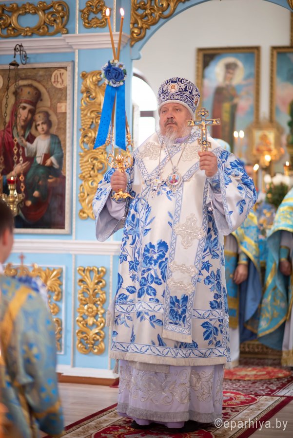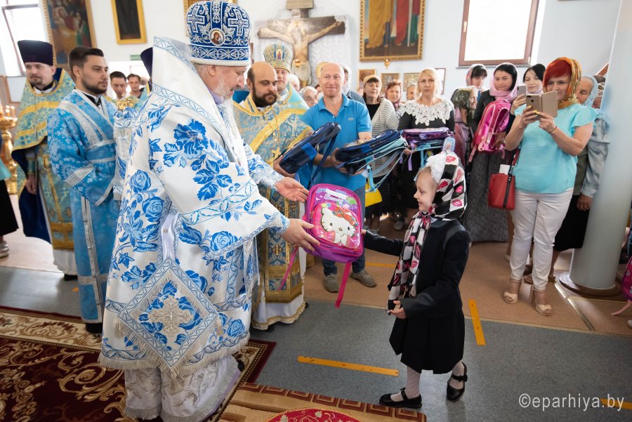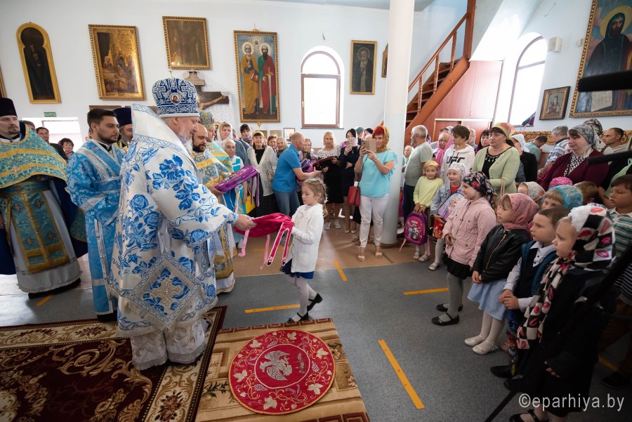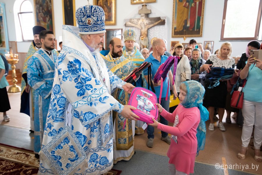 Пресвятая Богородица, как любящая мать, всегда помогает своим чадам. Потому и приходят к ней люди со своими бедами и скорбями, и не счесть сколько чудесных исцелений происходит по горячей молитве у ее святого Образа. Божественную литургию в праздник Толгской иконы Божией Матери в храме Покрова Пресвятой Богородицы в г. Речица 21 августа 2020г. возглавил Высокопреосвященнейший Стефан, архиепископ Гомельский и Жлобинский. Высокопреосвященнейшему сослужили: секретарь Гомельской епархии протоиерей Георгий Алампиев, благочинный Речицкого округа протоиерей Алексий Пешко, настоятель прихода протоиерей Николай Ефименко и духовенство епархии. В преддверии нового учебного года, в рамках ежегодной благотворительной акции «Собери портфель школьнику», проводимой Гомельской епархией, Владыка Стефан вручил маленьким прихожанам рюкзаки со школьными принадлежностями. Высокопреосвященнейший Стефан поздравил причастников с принятием Святых Христовых Таин и обратился к молящимся со словами Архипастырского назидания. Список икона божией Матери Толгская в храм Покрова Пресвятой Богородицы была передана из семьи певчей храма Матрены Подуст в восьмидесятых годах прошлого века. Семейное предание сохранило воспоминание о том, что в дом семьи пришел протоиерей Петр (Латушко) и, увидев икону, сказал, что ей надлежит быть в храме. Вскоре после этого она была передана в храм. История обретения чудотворной иконы уходит своими корнями в 1314 год. Святой образ был дарован небесами самым чудесным образом Ростовскому святителю Прохору (в схиме Трифону). Объезжая епархию, святитель отправился вниз по реке Волге и для ночевки была выбрана местность, где речка Толга впадает в Волгу. Когда стемнело, епископ увидел исходящий с неба столб огня. Он пошел к тому месту и увидел, что яркий свет исходит из образа Богородицы с Богомладенцем на руках. Епископ стал горячо молиться святому Лику и провел остаток ночи в молитвенном бдении. Вернувшись к месту стоянки, Прохор заметил, что его жезл остался на месте ночного молитвенного бдения. Когда слуги вернулись с места поиска, то принесли с собой нерукотворную икону Богородицы: она находилась рядом с жезлом. Святитель сразу же узнал на иконе образ Богоматери, который явился ему в видении. После горячей молитвы перед иконой на том месте была заложена церковь. |