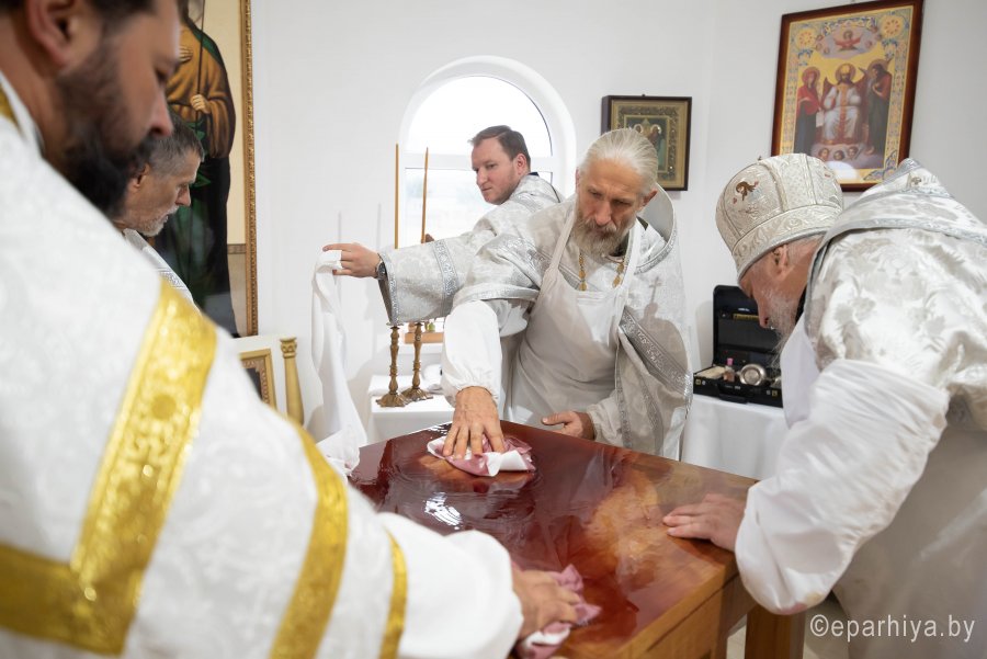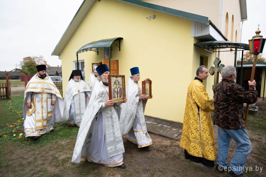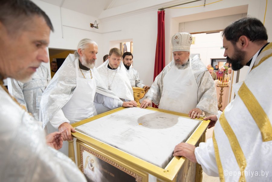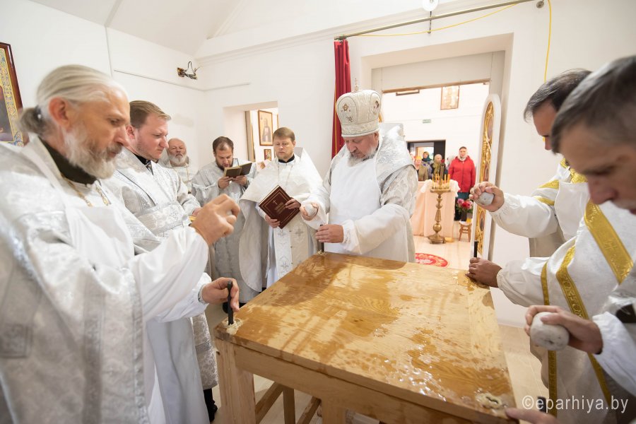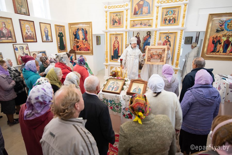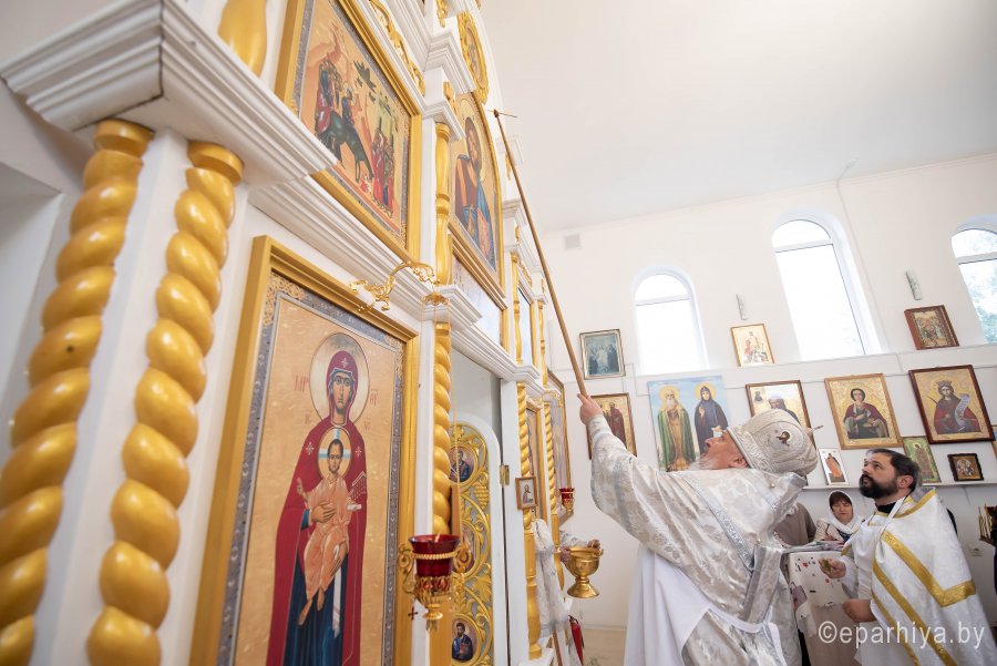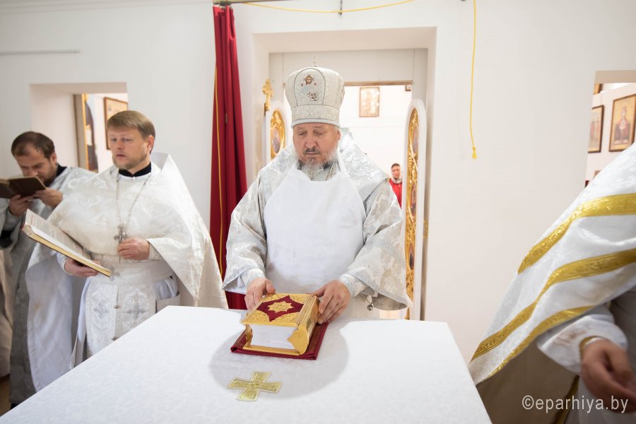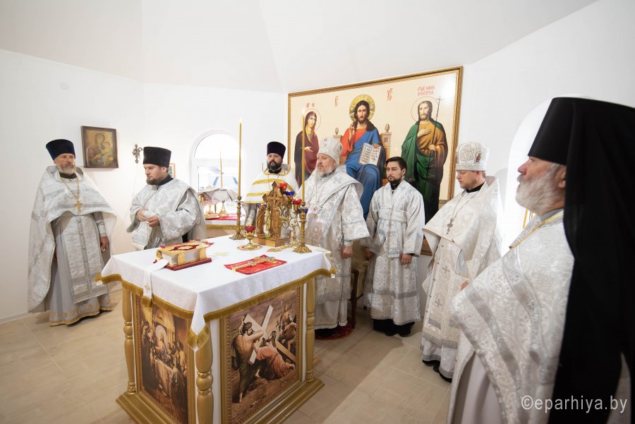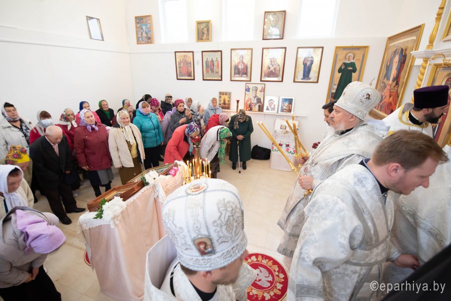Чин освящения храма Вознесения Господня д.Рудня Маримонова и Божественную литургию в день памяти преставление апостола и евангелиста Иоанна Богослова 9 октября 2020г. совершил Высокопреосвященнейший Стефан, архиепископ Гомельский и Жлобинский. Высокопреосвященнейшему сослужили: секретарь Гомельской епархии протоиерей Георгий Алампиев, благочинный Гомельского районного округа протоиерей Артемий Кривицкий, настоятель прихода протоиерей Петр Слепенок и духовенство епархии. Во время Литургии были вознесены сугубые молитвенные прошения о даровании мира белорусскому народу и прекращении распространения вредоносного поветрия. По завершении богослужения Высокопреосвященнейший Стефан обратился к прихожанам со словами архипастырского назидания и рассказал об антиминсе – неотъемлемой части церковных служб, без которого не совершается ни одна Литургия. Антиминс – это прямоугольный матерчатый плат из шелка или льна (гладкой ткани, на которой легко подбирать частички Тела Христового или проскомидийных частичек). Сам антиминс представляет собой вышитую икону положения Спасителя во гроб, т. е. образ Тела и Крови Христовых, а на верхней стороне вшиты частицы святых мощей. Во время служения Литургии верных и основной ее части – Евхаристическом каноне, на котором происходит пресуществление Святых Даров, антиминс открыт. Фактически на нем и происходит великое Таинство Евхаристии. Он закрывается перед окончанием Божественной литургии, когда священник от лица всех верующих благодарит Господа за то, что Всевышний сподобил людей причастия святых Христовых Таин. По окончании богослужения владыка Стефан возглавил Крестный ход, поздравил причастников с принятием Святых Христовых Таин, преподал всем архипастырское благословение и в память об общей молитве раздал всем присутствующим иконки.