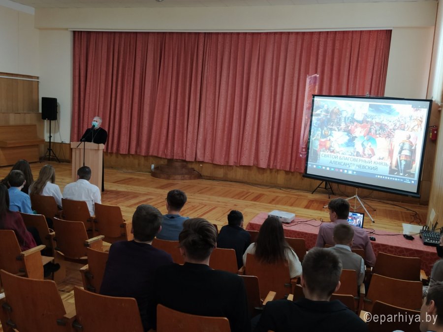 Более шестидесяти ребят ГУО «Средняя школа №10 г. Жлобина» пришли на встречу с протоиереем Павлом Бондарчуком, клириком храма Святой Живоначальной Троицы г. Жлобина. Ребята старших классов собрались в актовом зале на «Час духовного общения». Поводом к ней послужили юбилейные события – 550-летие обретение национальной святыни Жировицкой иконы Божией Матери и 800-летие со дня рождения Александра Невского, святого, удивительного государственного мужа, патриота, беззаветно любившего свой народ, страну. С помощью современных средств мультимедиа, ребята смогли окунуться в историческую эпоху и провести параллели с современными днями, увидеть глубину духовную людей прошлого и настоящего и определить для себя высоту. Материал предоставлен Жлобинским благочинническим округом