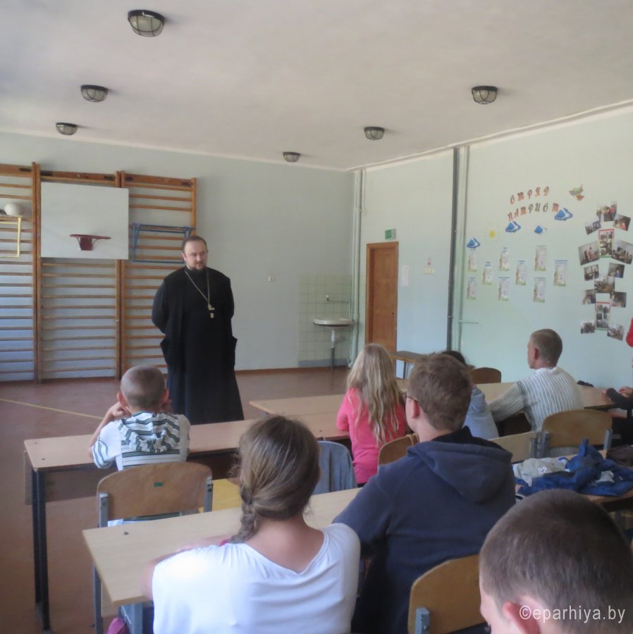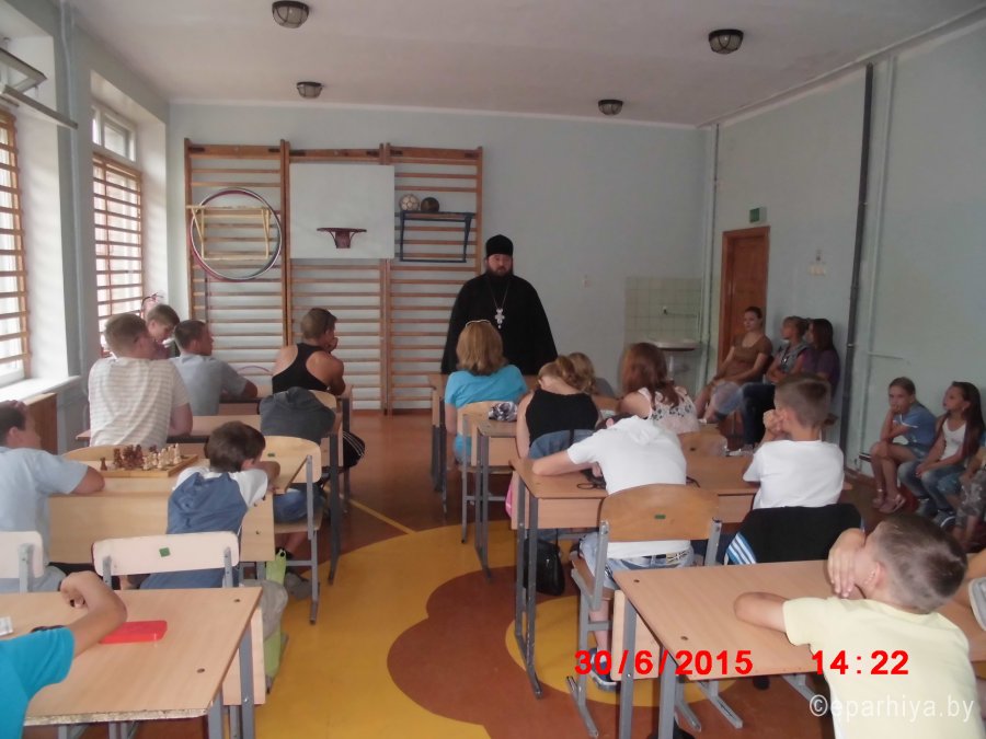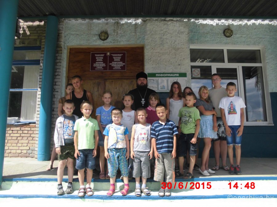 На базе образовательного учреждения № 7 города Жлобина организован школьный летний лагерь «Патриот», для детей склонных к нарушениям дисциплины и правопорядка. Лагерь организован при поддержке районного отдела образования, комиссии по делам несовершеннолетних райисполкома и направлен на создание дополнительных возможностей для организации позитивного досуга, воспитания и обучения подростков, требующих повышенного педагогического внимания. Работает лагерь с 29 июня по 21 июля. Численность детей составляет 20 человек от 8 до 14 лет. По предложению учителя школы Бураковой Елены Николаевны с детьми еженедельно проводились встречи священнослужителей благочиния. 30 июня в гостях у детей был, настоятель храма Иоанна Воина, иеромонах Кронид (Печевистый). Беседа с детьми проводилась в виде диалога. Дети знакомились с азами православной веры. 7 июля состоялась беседа с настоятелем храма святителя Василия Великого иереем Вячеславом Рябицей. Батюшка из собственного опыта рассказал детям о воспитании детей в семье, о православном учении. У детей остались самые хорошие впечатления от встречи. 15 июля состоялась встреча клирика Свято – Троицкого собора иерея Павла Кулиша. Тему беседы выбрали сами дети: о смысле жизни и своем месте в ней. Так же в программе пребывания летнего лагеря были экскурсии по предприятиям города, памятникам истории и архитектуры, встречи с интересными людьми. |