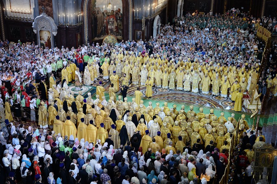 28 июля 2015 года, день памяти святого равноапостольного князя Владимира, стал кульминацией церковно-государственных торжеств по случаю 1000-летия преставления Крестителя Руси. В этот день Святейший Патриарх Московский и всея Руси Кирилл совершил Божественную литургию в кафедральном соборном Храме Христа Спасителя г. Москвы. Его Святейшеству сослужили постоянные члены Священного Синода Русской Православной Церкви: митрополит Крутицкий и Коломенский Ювеналий; митрополит Кишиневский и всея Молдовы Владимир; митрополит Ташкентский и Узбекистанский Викентий, глава Среднеазиатского митрополичьего округа; митрополит Санкт-Петербургский и Ладожский Варсонофий, управляющий делами Московской Патриархии; митрополит Минский и Заславский Павел, Патриарший экзарх всея Беларуси; митрополит Волоколамский Иларион, председатель Отдела внешних церковных связей Московского Патриархата; главы делегаций Поместных Православных Церквей: от Константинопольской Православной Церкви — митрополит Милетский Апостол; от Александрийской Православной Церкви — митрополит Мемфисский Никодим; от Иерусалимской Православной Церкви — митрополит Вострский Тимофей; от Грузинской Православной Церкви — епископ Никорцминдский Вахтанг; от Сербской Православной Церкви — митрополит Черногорско-Приморский Амфилохий; от Румынской Православной Церкви — митрополит Тырговиштский Нифон; от Болгарской Православной Церкви — митрополит Видинский Дометиан; от Кипрской Православной Церкви — епископ Арсинойский Нектарий; от Элладской Православной Церкви — митрополит Калавритский Амвросий; от Албанской Православной Церкви — епископ Амантийский Нафанаил; от Польской Православной Церкви — епископ Семятычский Георгий; от Православной Церкви Чешских земель и Словакии — архиепископ Михаловско-Кошицкий Георгий; от Православной Церкви в Америке — архиепископ Оттавский и Канадский Ириней; члены делегаций Поместных Православных Церквей в священном сане; иерархи и священнослужители Московского Патриархата. На богослужении присутствовали полномочный представитель Президента Российской Федерации в Центральном федеральном округе А.Д. Беглов, председатель Комитета Совета Федерации ФС РФ по конституционному законодательству и государственному строительству А.А. Клишас, председатель Комитета Государственной Думы ФС РФ по безопасности и противодействию коррупции И.А. Яровая. Святой равноапостольный князь Владимир с 2002 года считается небесным покровителем Внутренних войск МВД России, поэтому среди молившихся были главнокомандующий Внутренними войсками Министерства внутренних дел Российской Федерации генерал-полковник В.В. Золотов, командование и воины Внутренних войск. Песнопения Литургии исполнили хор духовенства Московской областной епархии (регент — священник Сергий Голев) и Патриарший хор Храма Христа Спасителя (регент — И.Б. Толкачев). Богослужение транслировалось в прямом эфире телеканалов «Россия-1», «Россия-24», «РТР Планета», «Союз». Прямую трансляцию комментировал профессор Московской духовной академии А.К. Светозарский. Во время трансляции были организованы включения из Киево-Печерской лавры, где богослужение совершал Блаженнейший митрополит Киевский и всея Украины Онуфрий, и из Владимирского собора в Херсонесе, где Литургию во