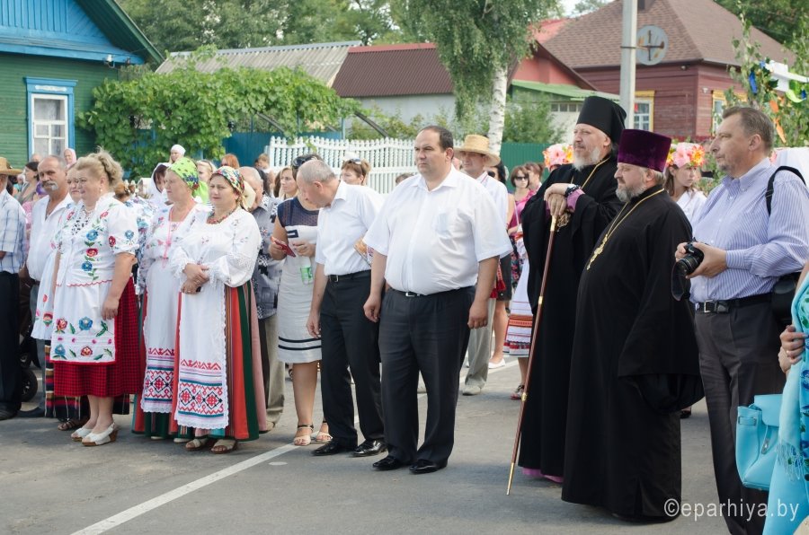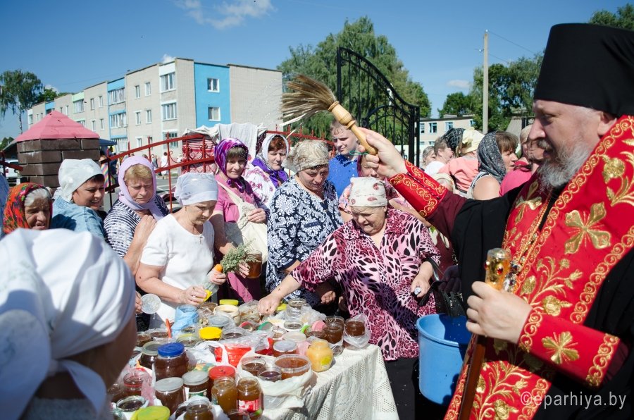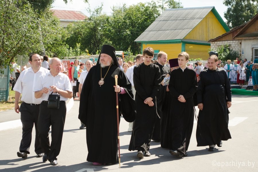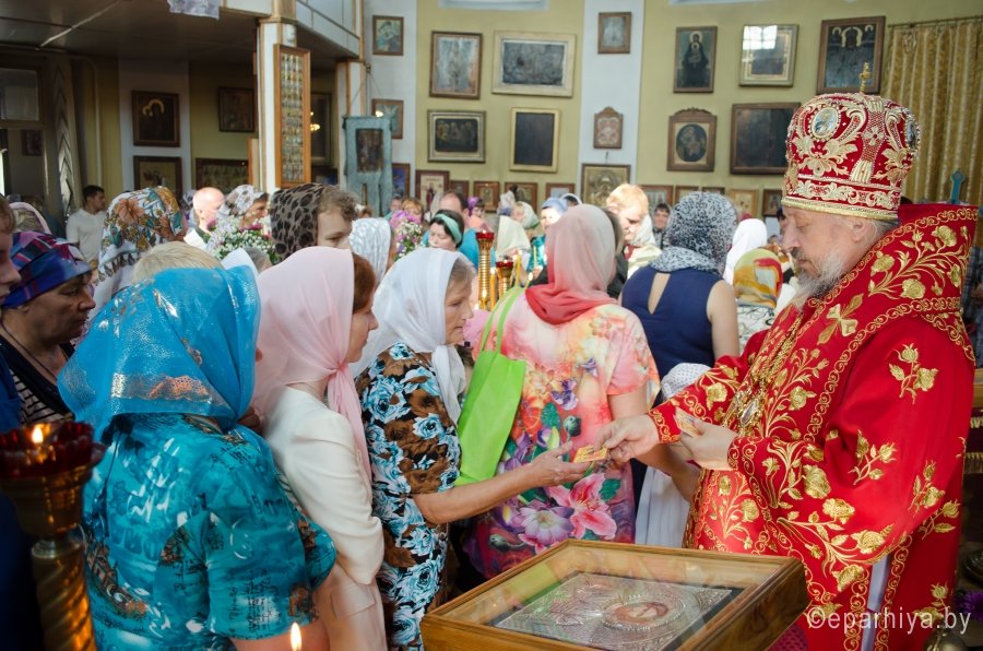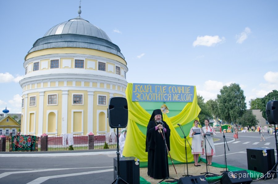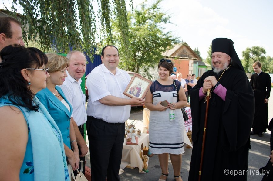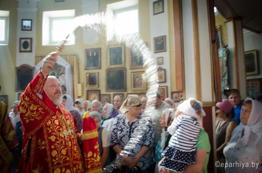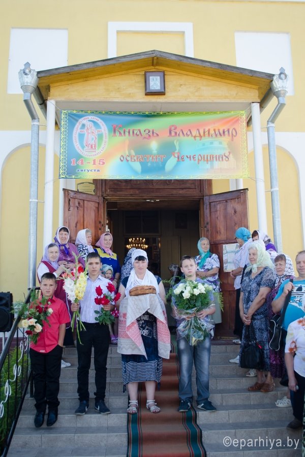 14 августа 2015г. Пресовященнейший Стефан, возглавил Божественную Литургию в храме Преображения Господня г.Чечерск. Владыке сослужили протоиерей Георгий Шмидов и духовенство храма. Во главе с Владыкой Стефаном, духовенство и прихожане храма встретили ковчег с частицей мощей святого равноапостольного князя Владимира. По завершению Богослужения Владыка Стефан обратился к прихожанам храма с проповедью, раздал иконки и освятил первый сбор меда, что принесли с собой прихожане к празднованию Происхождения (изнесение) честных древ Животворящего Креста Господня. Преосвященнейший Стефан, в ходе визита в храм Преображения Господня г. Чечерск, посетил праздничные мероприятия под названием "Край, где солнце золотится медом", которые были организованы в честь прибытия Крестного хода с частицей мощей святого равноапостольного князя Владимира и праздника называемого в народе "медовый спас". На празднике было организовано театрализованное выступление, широкая выставка-ярмарка прикладного творчества, выступил коллектив народной самодеятельности. Владыку Стефана сопровождали протоиерей Георгия Шмидова и представители городской администрации г. Чечерск. |