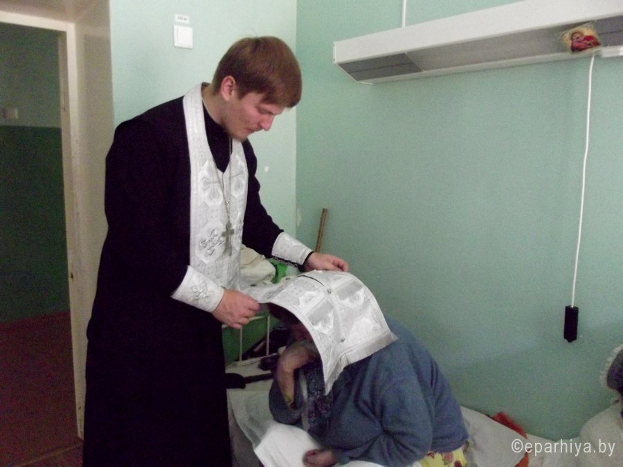 26 августа 2015 г. в преддверии праздника Успения Пресвятой Богородицы священнослужители Буда-Кошелевского благочиния протоиерей Павел Вечорко и иерей Александр Асадчий посетили больницу сестринского ухода в д. Рогинь. Во время визита болящие, а это 21 пациент больницы и из них 7 лежачих, приняли участие в таинстве Покаяния и были причащены Св. Христовых Таин. По совершении таинств протоиерей Павел обратился к собравшимся с пастырским словом, пожелав пациентам терпения в нелегком жизненном пути, напомнил о необходимости преображения своей души, на примере недавнего праздника Преображения Господня и рассказал о наступающем празднике Успения Пресвятой Богородицы. Все пациенты больницы и особенно причастившиеся Тела Христова выразили свою благодарность священнослужителям за визит и посильную поддержку. |