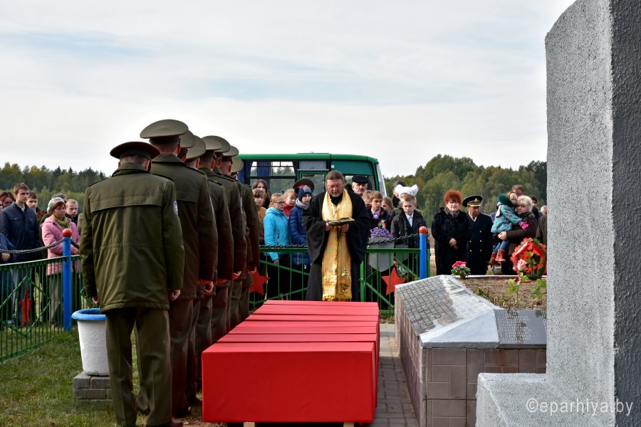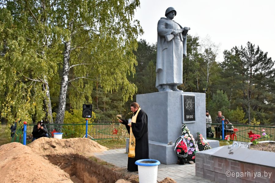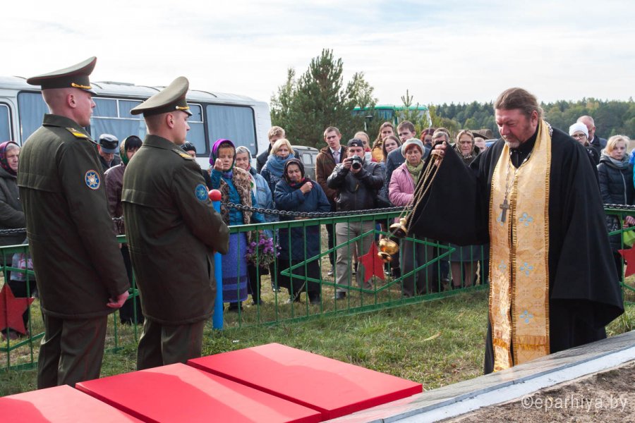 С осени 1943 и до конца июня 1944 года шли кровопролитные бои по освобождению Жлобинщины от немецко-фашистских захватчиков. Точное число погибших за это время советских солдат и офицеров до сих пор неизвестно. К сегодняшнему дню земле преданы более 11 тысяч наших воинов. 13 октября 2015 года были перезахоронены останки еще 24 советских солдат и офицеров, обнаруженных 52-м объединенным поисковым батальоном Министерства обороны Республики Беларусь. Погибшие упокоились в братской могиле в деревне Антоновка Коротковичского сельского совета. Подобные церемонии проходят на Жлобинщине почти ежегодно. В них неизменно участвуют и православные священники. Заупокойный молебен об усопших воинах совершил настоятель Солонского прихода Рождества Богородицы Жлобинского благочиния протоиерей Виктор Коновалов. |