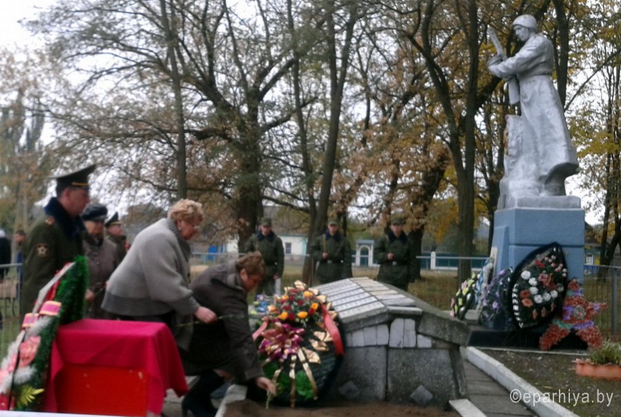 В агрогородке Гадиловичи Рогачёвского района 20 октября 2015г прошёл траурный митинг «Солдаты войны». У братской могилы собрались председатель районного совета депутатов Валентина Никифоровна Ганкович, начальник отдела идеологической работы, культуры и по делам молодёжи райисполкома Михаил Фёдорович Зайцев , председатель Гадиловичского сельского совета Галина Андреевна Рудая, председатель районного совета ветеранов Бронислава Владимировна Кирейшина, подполковник Олег Владимирович Сочивко, учащиеся школы, жители и гости а.г. Гадиловичи, чтобы почтить память погибших защитников Отечества и жертв времён Великой Отечественной войны. 21 августа 52-м отдельным специализированным поисковым батальоном войсковой части №28443 были проведены поисковые работы с раскопками в агрогородке Гадиловичи Рогачёвского района, во время которых были обнаружены останки неизвестного военнослужащего Советской Армии. Священнослужитель храма Святого благоверного князя Александра Невского в г. Рогачёве протоиерей Александр Атрощенко отслужил панихиду. Останки воина были перезахоронены в братской могиле. В честь неизвестных солдат, отдавших свои жизни в борьбе с немецко-фашистскими захватчиками, прозвучали залпы траурного салюта. Присутствующие возложили цветы и венки к братской могиле. |