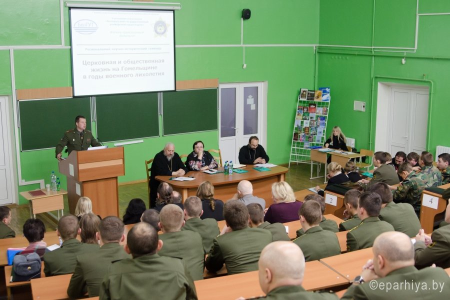 12–13 ноября 2015 года по благословению Преосвященнейшего Стефана, в рамках XII Покровских образовательных чтений, состоялся Региональный научно-исторический семинар «Церковная и общественная жизнь на Гомельщине в годы военного лихолетья». Организаторами выступили: Гомельская епархия Белорусской православной церкви, военно-транспортный факультет в УО «Белорусский государственный университет транспорта», ГУО «Гомельский инженерный институт» МЧС Республики Беларусь. Епископ Гомельский и Жлобинский Стефан поприветствовал собравшихся и отметил, что «подобные семинары в назидательной форме позволяют преподнести молодому поколению исторических факты тяжелых военных лет, помогают воспитывать в молодежи правильные духовно-нравственные ориентиры на примерах наших прославленных земляков». Хочется отметить, что на семинар, заявленный как региональный, отозвались представители не только Гомельской области. На семинаре присутствовали представители духовенства Гомельской епархии, УО «Гомельский государственный медицинский колледж», УО «Мозырский государственный педагогический университет им. И. П. Шамякина», курсанты ВТФ в УО «БелГУТ», ГУО «ГИИ» МЧС Республики Беларусь и многие другие. В первый день семинар, который состоялся на базе УО «БелГУТ», первую секцию открыла бакалавр теологии Свято-Филаретовского института (г. Москва) Ложкова Г. В. с докладом «Протопресвитер Виталий Боровой. Церковное служение в 1940-е годы» — «живая легенда» нашего времени. Интересным и эмоционально насыщенным было выступление Куликовича В. И.(к. филол. н., доцент, заведующий кафедрой редакционно-издательских технологий УО «БГТУ», г. Минск) с докладом «Партызанскія і падпольныя газеты Гомельшчыны (1943–1944 гг.)». Завершил свой доклад Владимир Иванович стихотворением В. Лифшица «Баллада о черством куске», которое нашло отклик в душах не только старшего, но и молодого поколения. Не менее увлекательными оказались доклады полковника А. А. Поддубного (начальника ВТФ в УО «БелГУТ»), А. Л. Айзенштадта (к. и. н., доцент УОФПБ «МУ МИТСО»), которые на примерах своих родственников показали героизм и мужество белорусского народа, проявленные в годы Великой Отечественной войны. Второй день в ГУО «ГИИ» МЧС Республики Беларусь состоялся в форме открытого диалога — докладчиками в этот день выступали курсанты и лицеисты Инженерного института. «Дорогие друзья, мне всегда очень приятно находиться в стенах этого прославленного учреждения, с которым нас связывает давнее и тесное сотрудничество…» — поприветствовал всех от имени владыки Стефана протоиерей Игорь Ольшанов, настоятель храма Святого Архангела Михаила, руководитель отдела по взаимодействию с Вооруженными Силами и правоохранительными органами Гомельской епархии. Открыл вторую секцию семинара иерей Алексий Сергеев, клирик кафедрального собора святых апостолов Петра и Павла, г. Гомеля. («Жизнь кафедрального собора святых апостолов Петра и Павла в г. Гомеле после Первой мировой войны. Протоиерей Александр Зыков»). В завершении семинара все собравшиеся получили возможность ознакомиться с новым издательским проектом «Духовное наследие Гомельщины», книга первая — архиепископ Аристарх (Станкевич) «Слова преподобного Семиона Нового Богослова и их особенности», которая будет издана Гомельской епархией с
