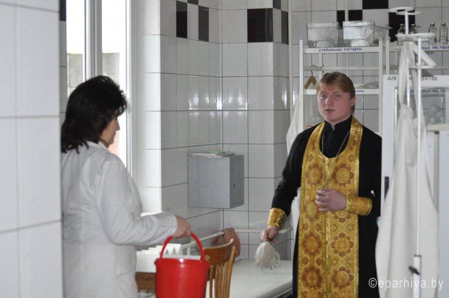 18 ноября 2015 года, клирики храма Преображения Господня г. Гомеля протоиерей Александр Цуканов и иерей Вадим Грицков, совершили чин освящения 4 отделения Учреждения Здравоохранения Гомельская областная инфекционная клиническая больница. После молебна, в котором приняли участия заведующий отделением Терешков Дмитрий Валерьевич и персонал, священнослужители окропили святой водой помещения отделения. Для находящихся на излечении пациентов - визит священнослужителей стал приятной неожиданностью, всех болящих окропили святой водой и пожелали скорейшего выздоровления. После освящения состоялась беседа священнослужителей с персоналом отделения. |
