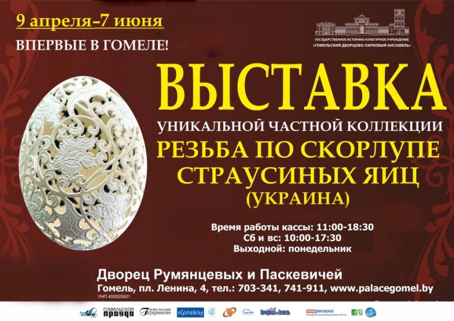 8 апреля, по благословению Преосвященнейшего Стефана, в музее Гомельского дворцово-паркового ансамбля начнет работу выставка уникальной частной коллекции «Резьба по скорлупе страусиных яиц», где будут представлены работы мастера Дмитрия Денисенко из Украины.Организатором выставки выступили: государственное историко-культурное учреждение «Гомельский дворцово-парковый ансамбль, генеральный директор – А.В. Гостев, директор музея учреждения – О.В. Торопова.