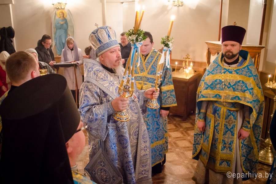 16 февраля 2016г., в попразднство Сретения Господня и день памяти правв. Симеона Богоприимца и Анны пророчицы. Равноап. Николая , архиеп. Японского. Прор. Азарии. Мчч. Папия, Диодора, Клавдиана. Мч. Власия Кесарийского, пастуха. Мчч. Адриана и Еввула. Блгв. кн. Романа Угличского. Свт. Симеона, еп. Полоцкого, еп. Тверского. Сщмчч. Иоанна, Тимофея, Адриана, Василия пресвитеров, прмч. Владимира, мч. Михаила, Преосвященнейший Стефан возглавил Божественную литургию в крестильном храме кафедрального Свято-Петро-Павловского собора г.Гомеля.Преосвященному сослужил духовенство собора.