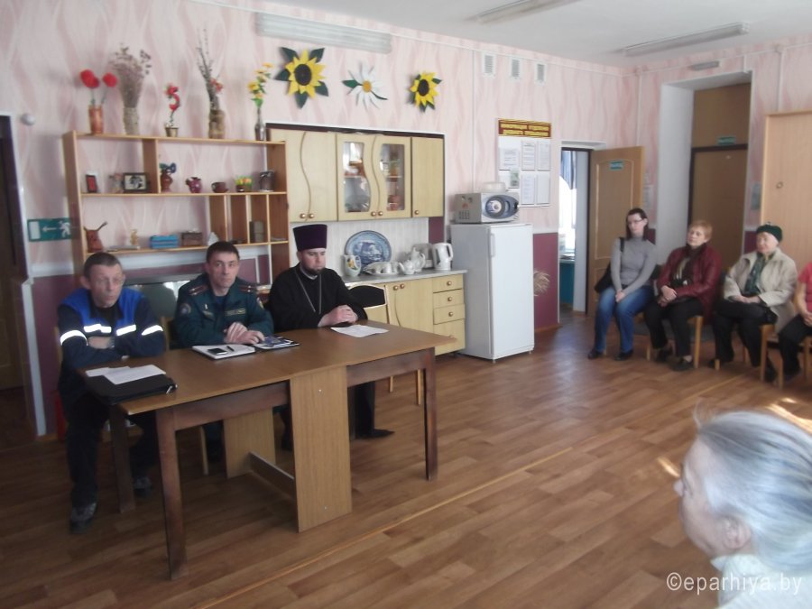 5 апреля 2016 г. в Светлогорском территориальном центре социального обслуживания населения, отделения дневного пребывания инвалидов и отделения для граждан пожилого возраста, состоялась акция «Безопасность в каждый дом».В рамках проведения этой акции приняли участие начальник Светлогорского МЧС Азаров Сергей Николаевич, инженер по охране труда Светлогорского РГС Вергун Игорь Иванович и клирик храма Преображения Господня г.Светлогорска иерей Виктор Шевеленко.