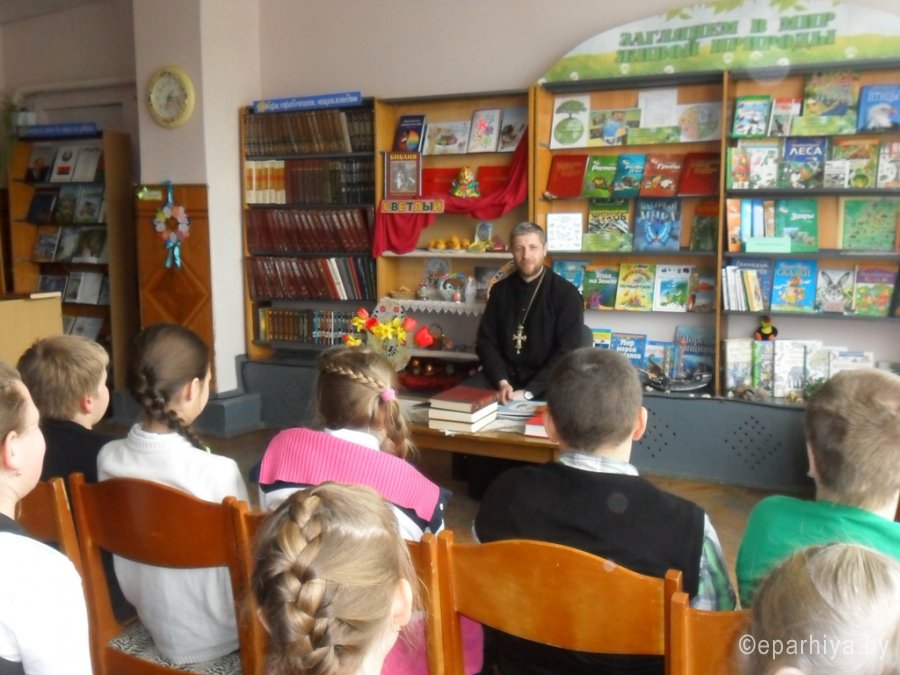 19 апреля для ребят ГУО «Детский сад – начальная школа №63» в детской библиотеке-филиале №12 им. С.Маршака прошел час православной культуры «Свет небесного чуда». На мероприятие был приглашен настоятель прихода храма в Грузинской иконы Божией Матери протоиерей Владимир Масалитин. Священник рассказал ребятам о чуде Воскрешения, о пасхальных традициях, а также познакомил детей с историей праздника, с тем, как принято его праздновать, ответил на многочисленные вопросы. Протоиерей Владимир Масалитин пояснил детям значение некоторых слов: святой, благодать, ангел, благая весть. Дети узнали, откуда пошла традиция красить яйца, а также о том, что главный смысл праздника — радость победы жизни над смертью, надежда на прощение, умиротворение и спасение.Все участники мероприятия получили в подарок пасхальные открытки в форме яйца и сладкое угощение.