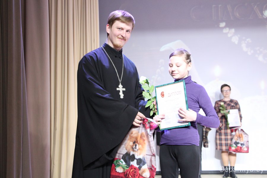 Первые дипломы и подарки были вручены победителям конкурсов видеороликов и презентаций о святом праведном Иоанне Кормянском, поскольку этот юбилейный фестиваль был посвящён 100-летию со дня его преставления. Заслуженные награды получили победители конкурса «Пасхальный кулич», интеллектуальной игры «Что? Где? Когда?», конкурса художественного слова «Пасхальный перезвон», II районной олимпиады по основам православной культуры. Теплые слова прозвучали в адрес педагогов, подготовивших победителей, творческих коллективов и солистов, подаривших музыкальные номера, организаторов и ведущих церемонии. Особую благодарность за многолетнее сотрудничество в сохранении духовно-нравственных традиций и организацию Пасхальных фестивалей отец Алексей выразил отделу идеологической работы, культуры и по делам молодёжи Рогачёвского райисполкома и лично его руководителю Зайцеву Михаилу Фёдоровичу.