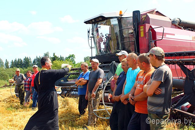 Настоятель храма Святителя Николая Чудотворца иерей Виталий Лехнович совершил молебен, благословил присутствующих и окропил освященной водой комбайнеров и технику. Он пожелал всем крепости духа и физических сил, ведь труд хлебороба нелегок: порой приходится работать и днем, и ночью, почти без отдыха, пользуясь благоприятной погодой. Каждый понимает ответственность и ценность времени в эту горячую пору. Также очень важна в уборочной готовность всей используемой техники к тяжелым нагрузкам, работа без поломок. На этом сделал акцент и председатель райисполкома Алексей Ясонов, он выразил надежду, что зерно будет собрано вовремя и в полной мере, пожелал всем успехов и здоровья.