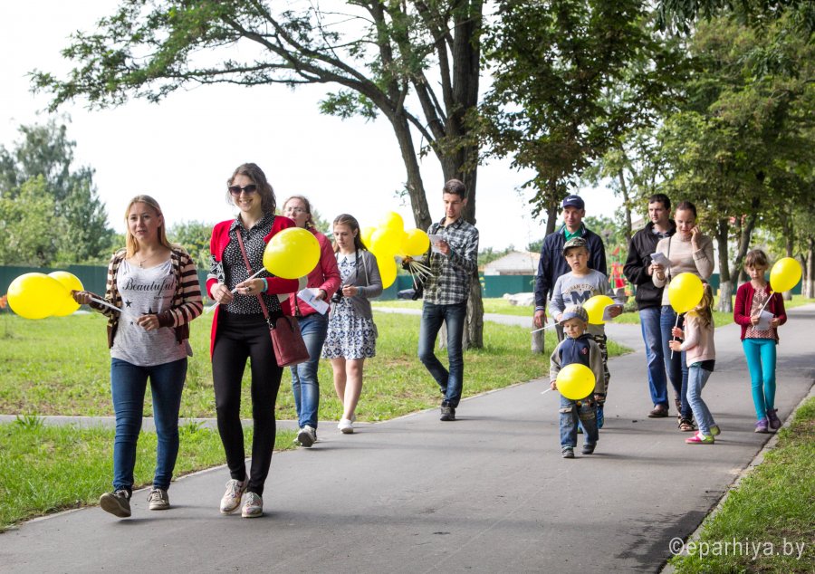 После посещения музея, землянки и военной техники под открытым небом, ребята с энтузиазмом поздравляли всех лоевчан с Днем памяти свв. князей Петра и Февронии: вручали листовки, шарики и традиционные ромашки.