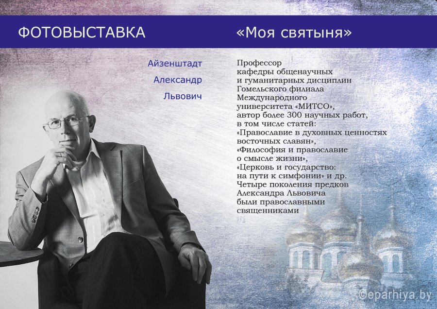 Открытие фотовыставки "Моя святыня" Айзенштадта Александра Львовича состоялось 25 декабря в храме святого Архангела Михаила в г.Гомеле.Профессор кафедры общенаучных и гуманитарных дисциплин Гомельского филиала Международного университета «МИТСО», автор более 300 научных работ, Александр Львович предстал в новой для себя роли, фотографа-художника, способного передать красоту православной культуры.