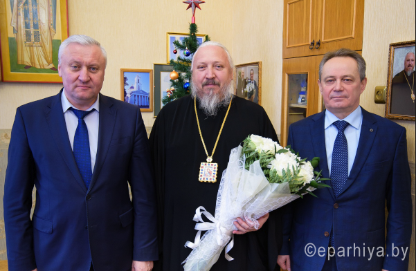 Губернатор Гомельской области Дворник В.А. и мэр г.Гомеля Кириченко П.А., 9 января посетили Гомельское епархиальное управление. В ходе своего визита высокие гости поздравили Преосвященного Стефана, епископа Гомельского и Жлобинского с Днем Тезоименитства.