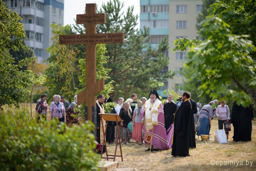16 июня 2018г. Высокопреосвященный Стефан в сослужении благочинного монастырей Гомельской епархии архимандрита Амвросия (Шевцова), благочинного Гомельского городского округа протоиерея Игоря Ольшанова и настоятеля храма иерея Дмитрия Загоруева совершил освящение поклонного креста на месте будущего строительства храма иконы Божией Матери "Скитковская".