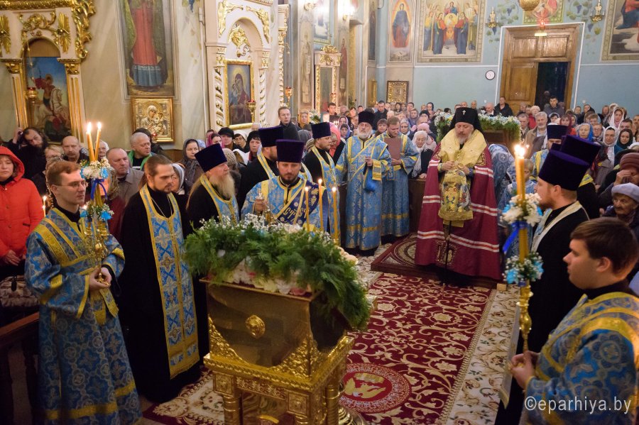 В Преображенский храм г.Гомеля были доставлены частица Ризы Господней в кресте-мощевике и ковчег с мощами святой блаженной старицы Матроны Московской. Встречу возглавил Высокопреосвященный Стефан, архиепископ Гомельский и Жлобинский с духовенством храма и многочисленной паствой, после чего было совершено молебное пение.