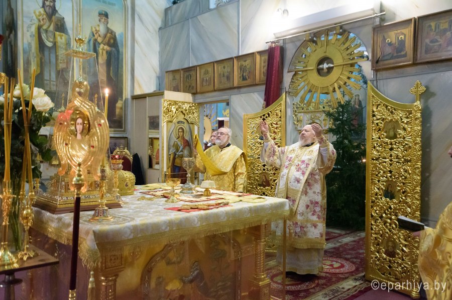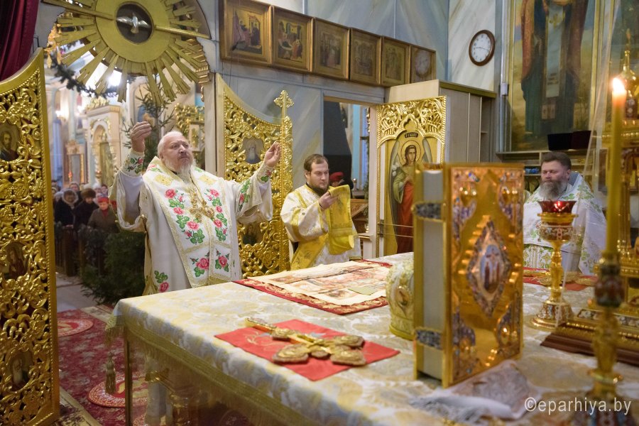 Божественную литургию в Рождественский сочельник 6 января 2019г. Высокопреосвященный Стефан совершил в Петро-Павловском кафедральном соборе г.Гомеля.Высокопреосвященному сослужили: секретарь Гомельской епархии протоиерей Георгий Алампиев и духовенство собора.