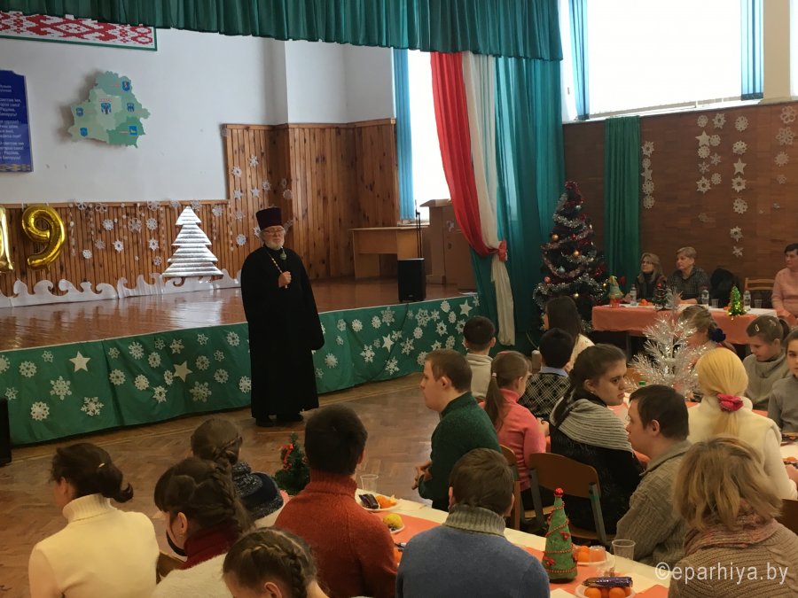 Ярким и насыщенным стал день 10 января в Приходе храма Преображения Господня г. Ветки. В дни продолжающегося праздника Рождества Христова священнослужители храма во главе с настоятелем - протоиереем Михаилом Борисёнком - провели две просветительско-благотворительные акции.Они посетили Ветковский ЦКРОиР и вручили детям с особенностями психофизического развития, находящимся на попечении Центра, сладкие подарки, а воспитателям подарили православные календарики на 2019 год.