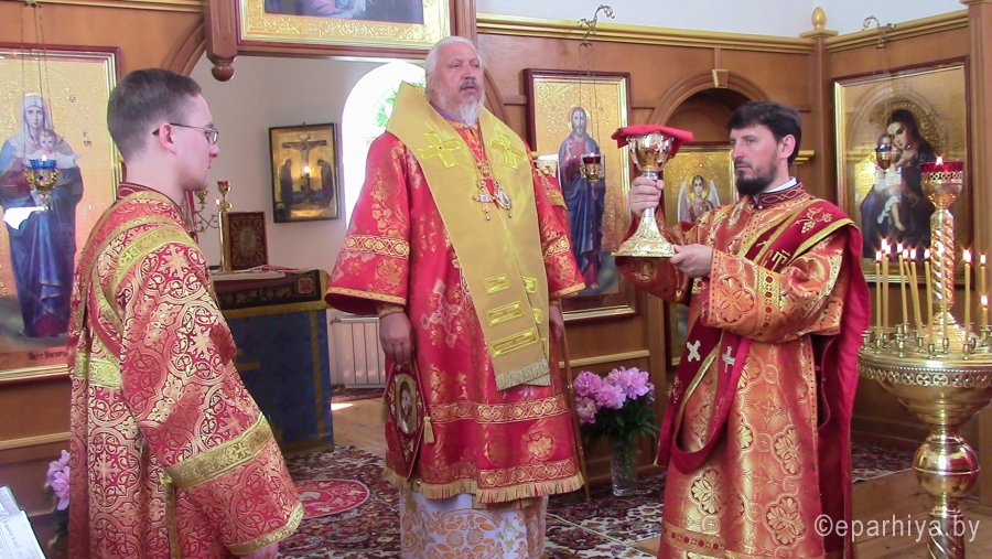 Владыке сослужили: секретарь Гомельской епархии протоиерей Георгий Алампиев и настоятель храма иерей Павел Земляков.