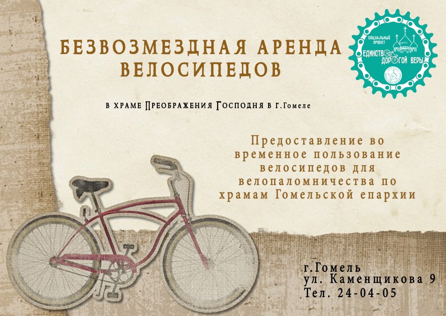 В рамках проекта «Единство дорогой веры», при поддержке международного открытого грантового конкурса «Православная инициатива 2018-2019» в храме Преображения Господня в г.Гомеле действует безвозмездная аренда велосипедов для паломничества и экскурсий на велосипедах по Гомельской епархии.Контактный телефон: 24 04 05