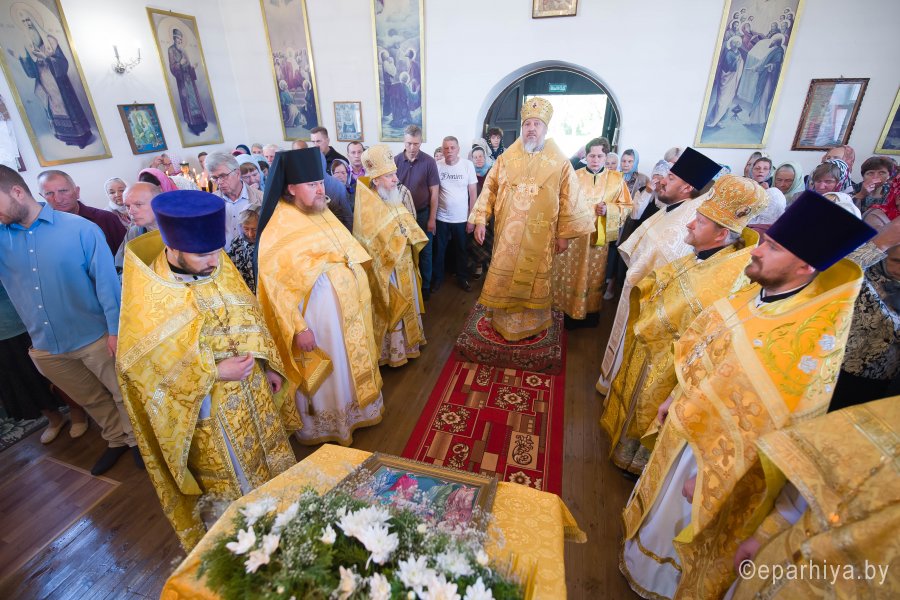 Высокопреосвященному сослужили: секретарь Гомельской епархии протоиерей Георгий Алампиев, благочинный Светлогорского округа протоиерей Александр Кисель, настоятель храма архимандрит Алексий (Желенок) и духовенство Гомельской епархии.