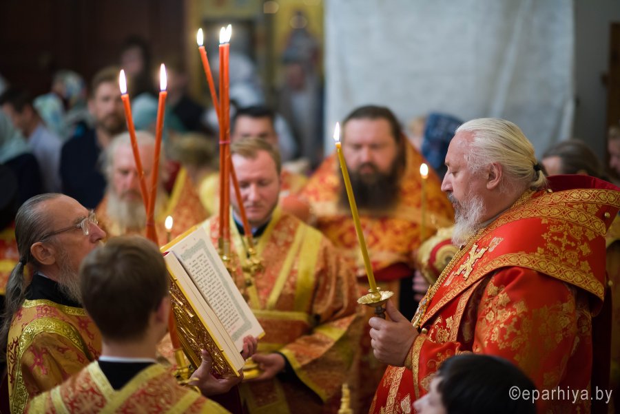 Высокопреосвященному сослужили: секретарь Гомельской епархии протоиерей Георгий Алампиев, благочинный монастырей Гомельской епархии архимандрит Амвросий (Шевцов), духовник Гомельской епархии протоиерей Стефан Гладыщук, благочинные округов Гомельской епархии, председатели епархиальных отделов, настоятели приходов и духовенство епархии.