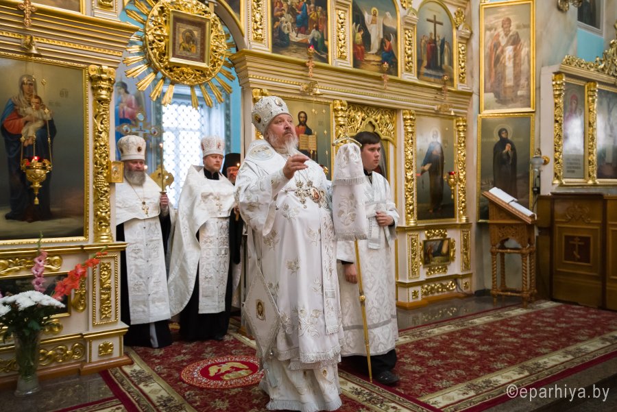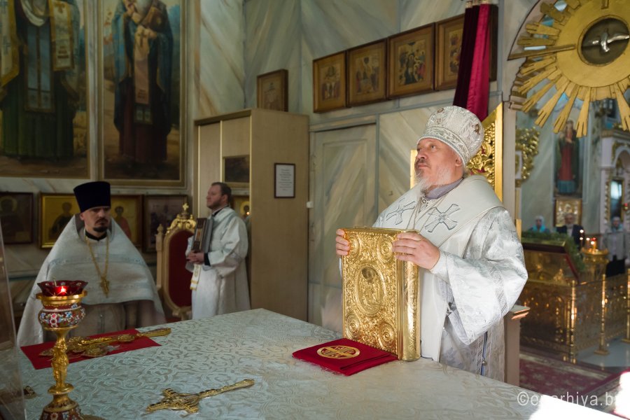 Высокопреосвященнейшему сослужили: секретарь Гомельской епархии протоиерей Георгий Алампиев, благочинный церквей Чечерского округа протоиерей Геннадий Хаткевич и духовенство собора.