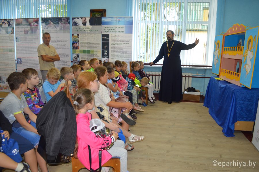Просветительские мероприятия в рамках реализации Программы сотрудничества между управлением образования Гомельского исполкома и Гомельской Епархией Белорусской Православной церкви, состоялись на базе летних оздоровительных лагерей, лагерей труда и отдыха учреждений образования Чечерского района.Воспитанники пришкольных лагерей ГУО "Гимназия г.Чечерска", "Средняя школа №1 г.Чечерска", "Коммуно-Ленинский ясли-сад - базовая школа" побывали на экскурсии в храме Преображения Господня в г.Чечерске. Клирик храма иерей Василий Ковальчук познакомил ребят с историей храма, главными святынями, рассказал истории икон. За чашкой чая ребята смогли задать батюшке волнующие их вопросы, на которые получили очень полные и поучительные ответы.