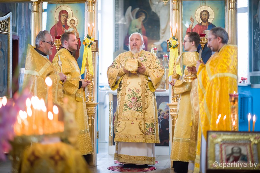 Высокопреосвященнейшему сослужили: секретарь Гомельской епархии протоиерей Георгий Алампиев, благочинный монастырей Гомельской епархии архимандрит Амвросий (Шевцов), благочинный Светлогорского округа протоиерей Александр Кисель и духовенство епархии.