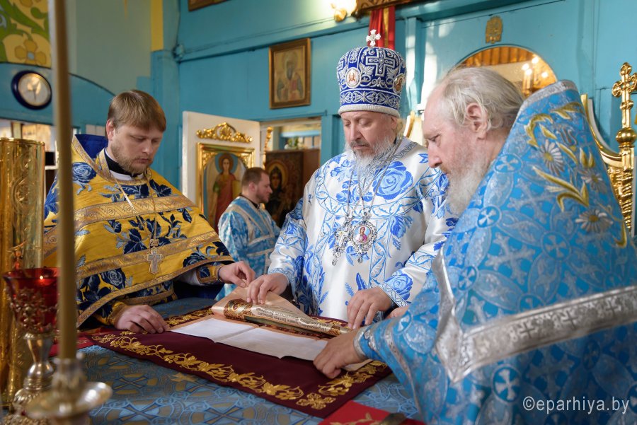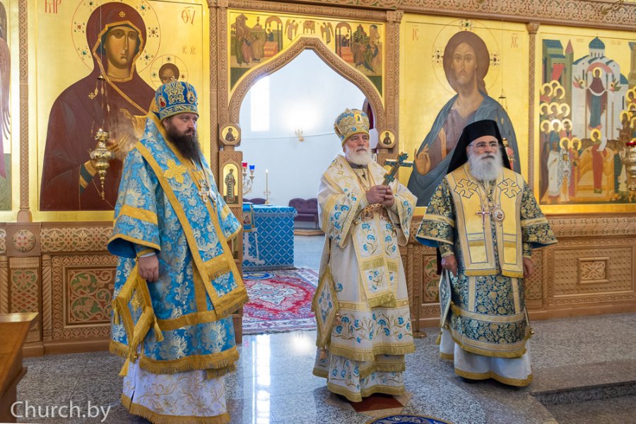 Архипастырям сослужили: настоятель прихода храма Покрова Пресвятой Богородицы протоиерей Виктор Беляков, секретарь Минской епархии протоиерей Андрей Волков и клирики Покровского храма.