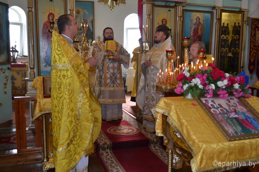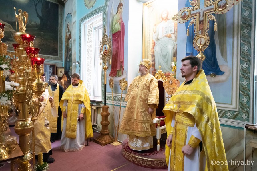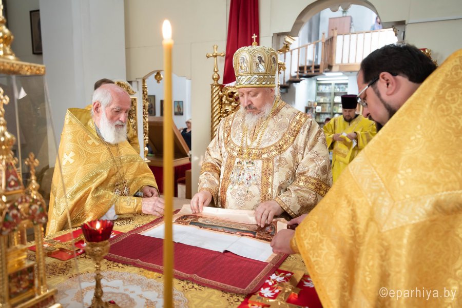 Высокопреосвященнейшему сослужили: секретарь Гомельской епархии протоиерей Георгий Алампиев, благочинные округов Гомельской епархии, председатели епархиальных отделов и духовенство епархии.