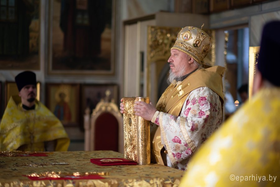 Высокопреосвященнейшему сослужили: секретарь Гомельской епархии протоиерей Георгий Алампиев, духовник Гомельской епархии протоиерей Стефан Гладыщук, благочинный Гомельского городского округа протоиерей Игорь Ольшанов и духовенство епархии.