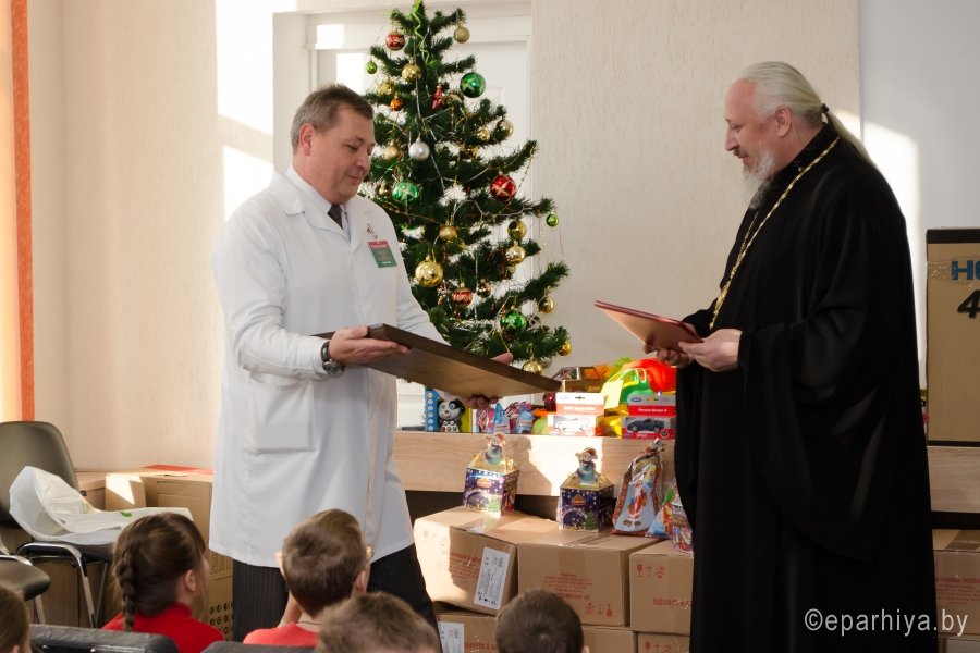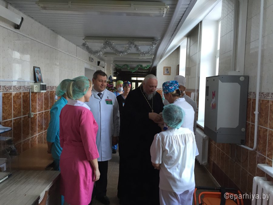 2 января 2016г., в преддверие празднования Рождества Христова, Преосвященный Стефан, епископ Гомельский и Жлобинский, в сопровождении руководителя Информационного отдела Гомельской епархии протоиерея Олега Костромы, посетил Гомельскую областную детскую клиническую больницу. Владыка встретился с персоналом учреждения здравоохранения, его руководителем Олегом Александровичем Зимелихиным и, конечно же, пациентами, которым он передал подарки. Рождественские акции, проводимые в этом медучреждении, уже стали традиционными. Вот уже четвертый год Преосвященный Стефан поздравляет пациентов и вручает детям подарки. В нынешнем году ребята получили большой набор игрушек в игровые комнаты, сладости, а в отделение больницы был передан телевизор. Обращаясь к собравшимся, Преосвященный Стефан пожелал им мира, благополучия и добра, а больным детям – скорейшего выздоровления. В ответ на теплые слова Преосвященного главврач детской больницы Олег Александрович Зимелихин поблагодарил Владыку, поздравил с 50-летием и преподнес в дар от лица всего медперсонала больницы икону первоверховных апостолов Петра и Павла и букет цветов. Преосвященный лично посетил палаты, включая тяжелобольных детей в реанимационном отделении. Он нашел теплые слова для матерей и отцов, благословил детей и каждому вручил Святой Образ, поздравив всех с грядущим праздником Рождества Христова. |