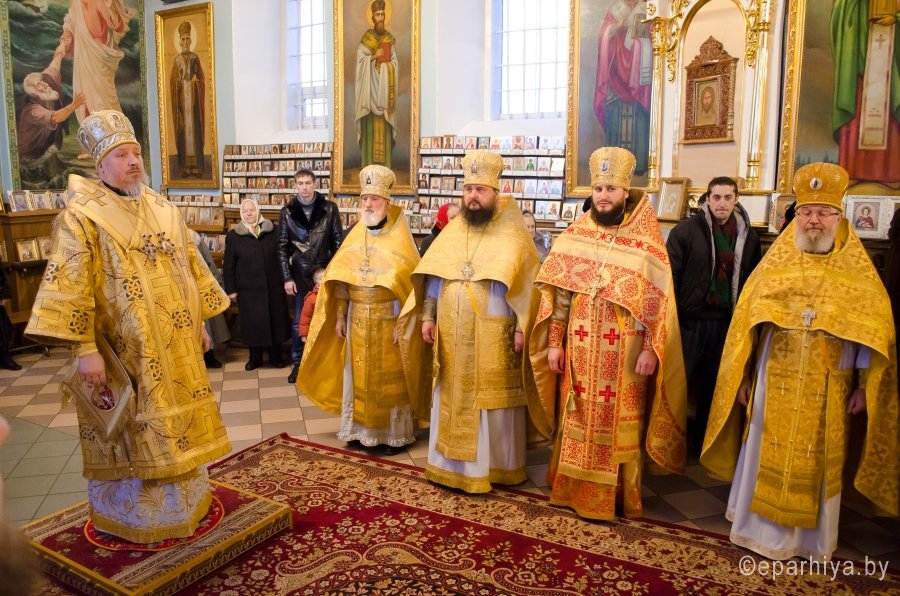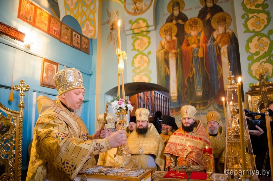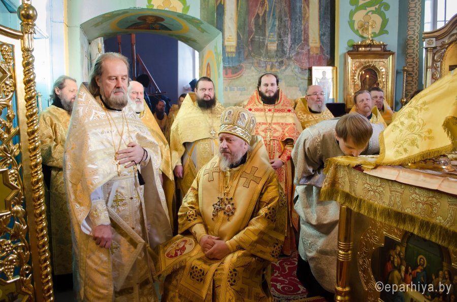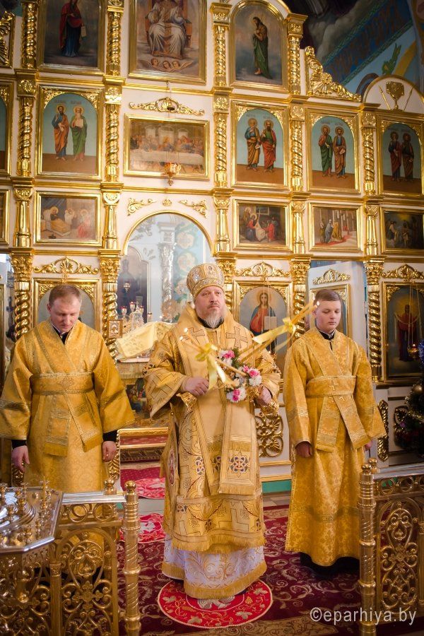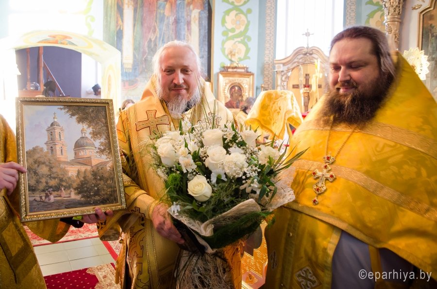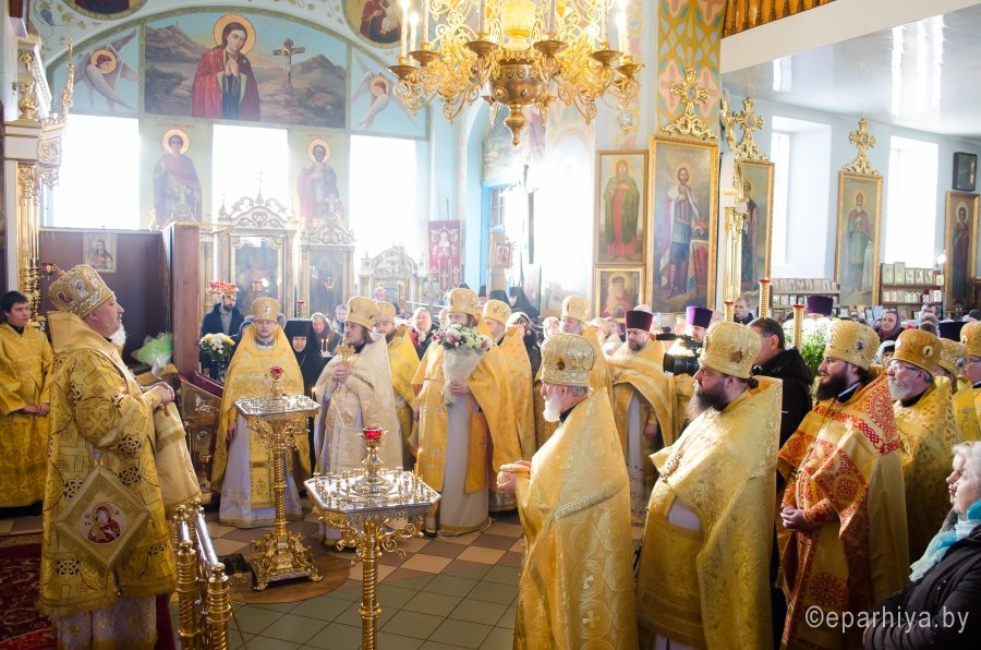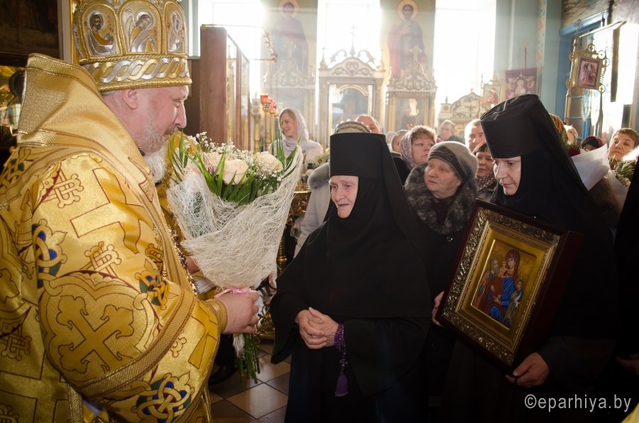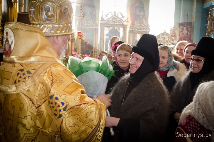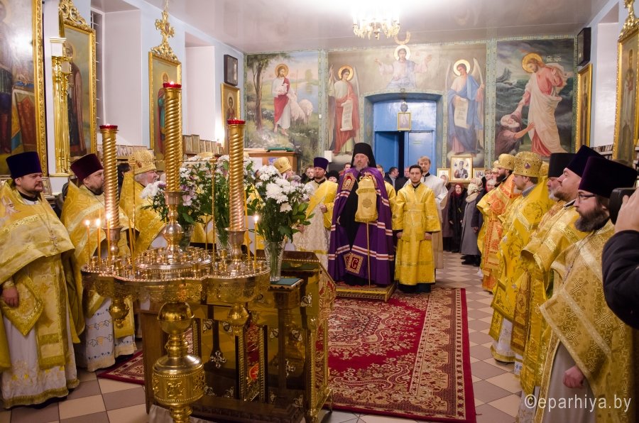 3 января 2016г., в день своего 50-летнего юбилея, Преосвященнейший Стефан возглавил Божественную литургию в Свято-Покровском храме Свято-Иоанно-Кормянского женского монастыря д.Корма Добрушского района. Преосвященному сослужили: секретарь Гомельской епархии протоиерей Георгий Алампиев, клирик Черниговской епархии архимандрит Роман (Расюк), благочинный монастырей Гомельской епархии архимандрит Амвросий (Шевцов), клирик Нежинской епархии архимандрит Афанасий (Дьяков), клирик Киевской епархии архимандрит Александр (Пелых), благочинные округов, руководители епархиальных отделов и духовенство епархии. Также на богослужении молились настоятельница Свято-Иоанно-Кормянского женского монастыря игуменья Платонида (Гордиченко), настоятельница Свято-Успенского женского монастыря игуменья Иоанна (Ярец) с сестрами, сестры Свято-Тихвинской обители, председатель Добрушского районного исполнительного комитета Ольга Федоровна Мохарева и представители светских властей района. За богослужением Владыка совершил хиротонию клирика Свято-петро-Павловского кафедрального собора г.Гомеля диакона Димитрия Жданова во иерея. Проповедь по запричастном стихе произнес насельник Свято-Никольского мужского монастыря архимандрит Савва (Мажуко). В завершении Литургии Владыка возглавил молебен святителю Петру, митрополиту Московскому и всея Руси чудотворцу, день памяти которого почитается Православной Церковью 3 января. Богослужебные песнопения исполнил народный молодёжный камерный хор «Возрождение» под управлением Галины Еременко. По окончании богослужения Владыка в своем пастырском слове рассказал о своем детстве, о своем пути к служению Матери Церкви, о том, какое значение несет в его жизни Свято-Иоанно-Кормянская обитель - неспроста литургию в день своего 50-летия Владыка совершил в Свято-Покровском храме женского монастыря. Здесь он был настоятелем храма, а позднее архимандритом. Именно благодаря его стараниям в 1991 году были обретены мощи святого праведного Иоанна Кормянского, который 30 апреля 1998 года был причислен к лику местночтимых святых. Секретарь Гомельской епархии протоиерей Георгий Алампиев зачитал поздравление Святейшего Патриарха Московского и всея Руси Кирилла Преосвященнейшему Стефану с 50-летием со дня рождения. От лица духовенства со словами поздравления к Владыке обратились благочинный Гомельской епархии протоиерей Стефан Гладыщук преподнеся просфору и благочинный монастырей Гомельской епархии архимандрит Амвросий (Шевцов) и преподнес в дар букет цветов. Затем Владыка принял поздравления от всех присутствующих. |