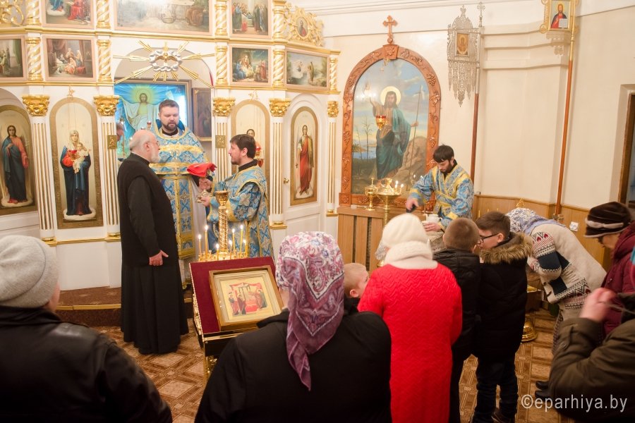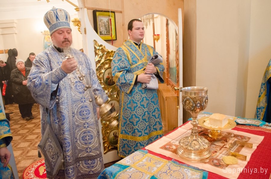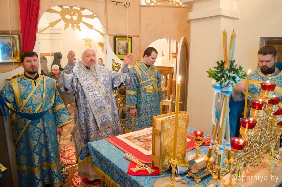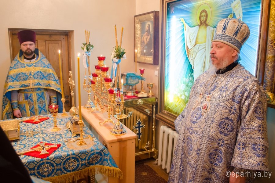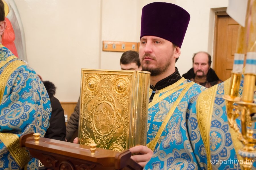 16 февраля 2016г., в попразднство Сретения Господня и день памяти правв. Симеона Богоприимца и Анны пророчицы. Равноап. Николая , архиеп. Японского. Прор. Азарии. Мчч. Папия, Диодора, Клавдиана. Мч. Власия Кесарийского, пастуха. Мчч. Адриана и Еввула. Блгв. кн. Романа Угличского. Свт. Симеона, еп. Полоцкого, еп. Тверского. Сщмчч. Иоанна, Тимофея, Адриана, Василия пресвитеров, прмч. Владимира, мч. Михаила, Преосвященнейший Стефан возглавил Божественную литургию в крестильном храме кафедрального Свято-Петро-Павловского собора г.Гомеля. Преосвященному сослужил духовенство собора. По окончании богослужения Владыка поздравил прихожан с праздником и обратился к молящимся со словом назидания, пожелав всем помощи Божией, поздравил причастников с принятием Святых Христовых Таин и преподал верующим архипастырское благословение. |
