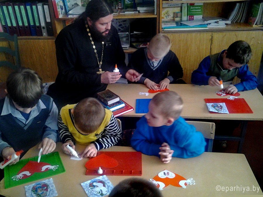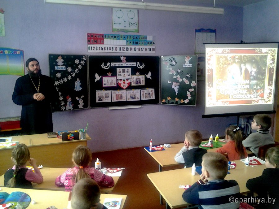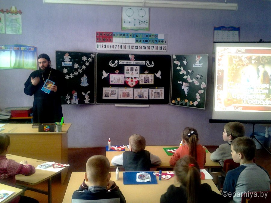 12 февраля 2016 года настоятель Свято-Никольского храма агрогородка Даниловичи иерей Андрей Булацкий посетил урок православной культуры в ГОУ «Даниловичский детский сад-начальная школа» Ветковского р-на, в котором реализуется Республиканский инновационный проект: «Внедрение модели формирования оптимистического типа мировосприятия у детей дошкольного и школьного возраста на православных традициях и ценностях белорусского народа». В рамках данного проекта, а также программы сотрудничества между ГОУ и Приходом Свято-Никольского храма прошел Открытый урок православной культуры, посвященный празднику Сретения Господня. На уроке присутствовала заведующая учреждения образования Скибунова Ирина Михайловна, а также учащиеся разных классов, учителя. Иерей Андрей поздравил всех присутствующих с наступающим праздником Сретения Господня, рассказал об его истории, а учащимся раздал сладости. Открытый урок подготовила и провела учитель начальных классов Ковалькова Анна Викторовна, преподаватель курса по основам православной культуры. Класс был красочно украшен, были подготовлены презентации и наглядные пособия. Учащиеся читали стихи, исполняли песни, посвященные празднику Сретения Господня, отвечали на вопросы учителя. В завершение урока ученики изготовили своими руками красочные сердечки с горлицами, как символ чистого сердца, открытого для встречи с Богом. |