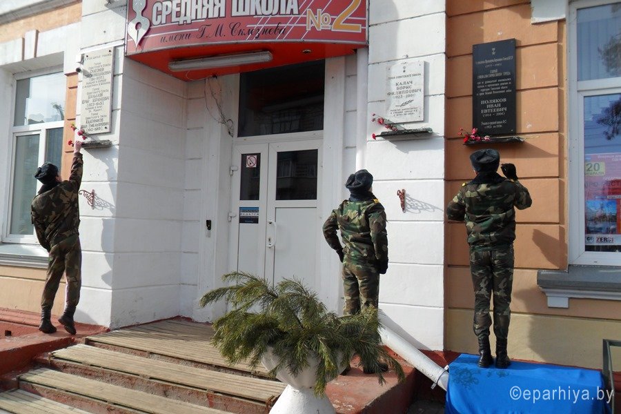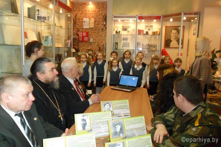19 февраля 2016 года накануне Дня защитника Отечества в музее «Боевой и трудовой славы» ГУО «Средняя школа № 2 им. Г.М.Склезнева г.Гомеля» для учащихся старших классов состоялся урок мужества. В мероприятии принял участие настоятель прихода храма Святого благоверного князя Александра Невского в г.Гомеле протоиерей Владимир Силенко. В своем обращении к подрастающему поколению священник отметил: «…Бог есть Любовь. Если мы хотим прийти к Нему, то должны научиться любить. Как говорил Иисус Христос: «Нет любви сильнее, чем та, когда человек жертвует своей жизнью ради ближних…». На уроке говорили о стремлении к миру, об отваге, мужестве, доблести, о патриотизме и о любви к Родине и ближнему. В ходе мероприятия учащиеся были не только слушателями. Они сами подготовили материалы о судьбах земляков, совершивших отважные и мужественные поступки. Урок мужества сопровождался показом слайдов, рассказывающих о подвигах людей во время Великой Отечественной войны. В числе почетных гостей также присутствовали: почетный гражданин Новобелицкого района Асадчий Д.Д., представитель Новобелицкой районной организации ОО «Белорусский союз офицеров» подполковник запаса Мацудов И.Н., председатель Новобелицкой районной организации ОО Белорусского Общества Красного Креста Патеева С.П., а также кадеты ГУО «Средняя школа № 3 им. Д.Н.Пенязькова г.Гомеля». Завершилось мероприятие возложением цветов воспитанниками военно-патриотического клуба школы к мемориальным доскам героям-землякам, которые учились в этой школе. |