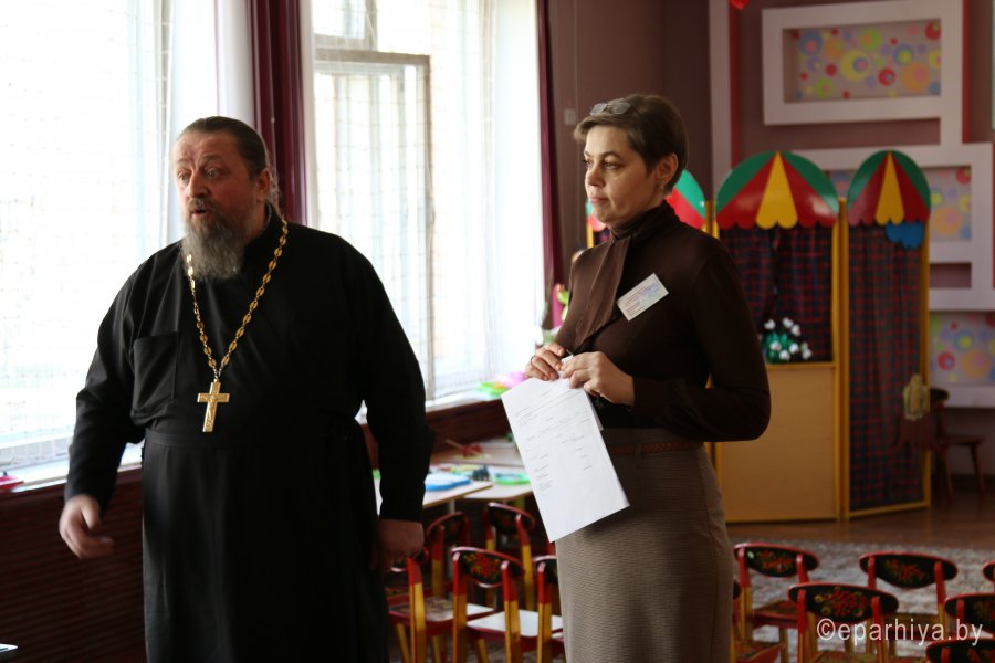 29 марта 2016 года в ГУО «Ясли-сад №111 г. Гомеля» состоялось открытое мероприятие в ходе реализации образовательных программ повышения квалификации педагогических работников и специалистов образования. Участникам были представлены: фрагмент структурированного занятия в адаптационной группе «Я спешу в детский сад», родительский час, выставка семейных газет и книжек-малышек. Работа семинара прошла в формате круглого стола. В рамках реализации инновационного проекта по взаимодействию учреждений образования и Белорусской Православной Церкви в семинаре приняли участие сотрудники прихода храма святого Архангела Михаила в г. Гомеле: иерей Петр Кебиков, Наталья Прищепова, Татьяна Маруняк. Для воспитанников и гостей учреждения была продемонстрирована презентация «Книги - добрые волшебники», из которой ребята узнали об истории появления и развития книги; макеты книг, свитки из папируса можно было не только увидеть на экране, но и потрогать своими руками. «И пусть сегодня наши малыши немного удивлены тому, какой долгий путь прошла даже самая маленькая книга, прежде чем попасть к ним в руки. Одно они запомнили наверняка: книга – это добрый волшебник и помощник. Она несет в себе частичку души человека, который ее создал» - отметила Короткевич Е.В. (заведующий ГУО «Ясли-сад №111 г. Гомеля»). В презентации были использованы материалы УМК «История книги» канд. филол. наук В.И. Куликовича. В завершении встречи иерей Петр Кебиков рассказал участникам семинара о Великом посте, его роли в жизни православных христиан. |