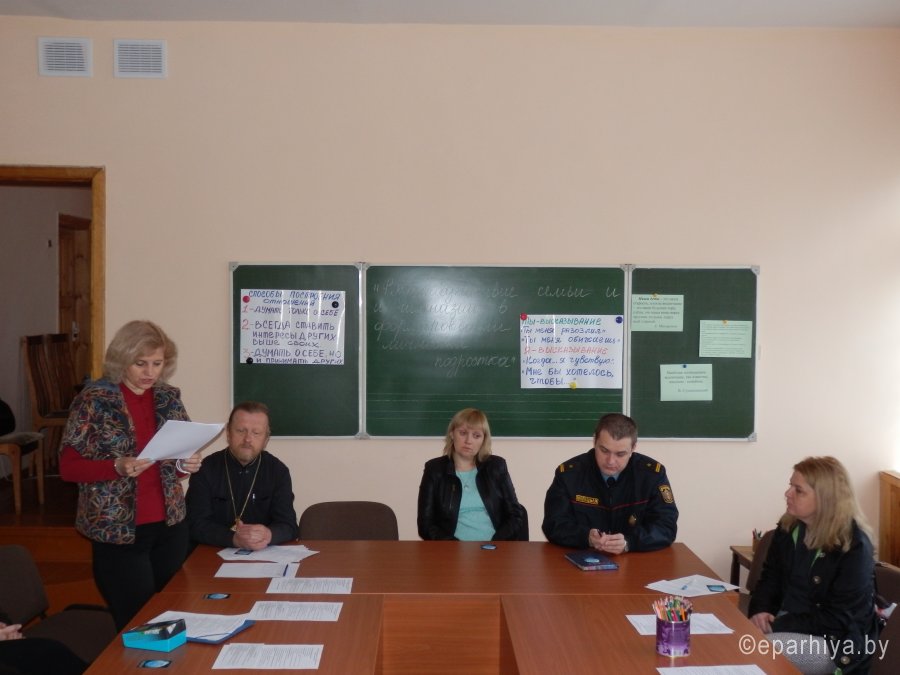 16 апреля 2016г. в ГУО «Гимназия г. Светлогорска» прошла встреча за круглым столом на тему: «Взаимодействие семьи и гимназии в формировании личности подростка». В кабинете психолога собрались родители учеников школы и специалисты различного направления, чтобы побеседовать о том, как положительно влияет совместная работа родителей и педагогов школы на воспитание детей. Благочинный Светлогорского округа, настоятель храма святых апостолов Петра и Павла протоиерей Владимир Семенов рассказал о проблемах духовного характера у подростков и современной молодежи связанной с компьютерной зависимостью. Из своей практики привел различные примеры, когда люди доходят до крайности от компьютерной зависимости и реальная жизнь им безынтересна. От нас зависит воспитание наших детей и в наших руках есть возможность изменить все в лучшую сторону. Господь есть любовь, Он долготерпелив и многомилостив и мы должны также любить ближних, своих домочадцев прощать их и наставлять на правильную жизнь согласно заповедям Божьим. Храни вас Бог, с Великим Постом. Социальный педагог государственного учреждения образования «Гимназия г.Светлогорска» Володькина Мария Андреевна, в своём выступлении рассказала о разных аспектах воспитания подростков в семье, а так же о программах и работе проводимой с учениками и родителями.- «Воспитание будет успешным," - сказала она, – "Если оно будет совместным, родителей и педагогов гимназии. Даже если есть какие-то неурядицы в семье на бытовой почве, то любовь все покрывает и изменяет в лучшую сторону». Начальник инспекции по делам несовершеннолетних Букреев Вадим Анатолиевич в своём выступлении отметил, что встреча с родителями на тему правонарушений и административных наказаний имеет больший эффект, нежели общаться непосредственно с подростками: « Они равнодушно и теплохладно к этому относятся, уверены что с ними это не произойдет, но когда попадают в отделение за распространение наркотиков, уже поздно. На сегодняшний день уличных драк стало меньше, чем было раньше, но молодежь стала более ухищренная и на данный момент киберпреступность, как разновидность преступления растет». Детский врач-психиатр Букатова Ирина Михайловна рассказала о причинах психологических расстройств и какие бывают признаки у детей склонных к суициду. Ирина Михайловна порекомендовала в случае подозрительного поведения у ребенка проверить анализы в лаборатории и не боятся обратится к психологу. |