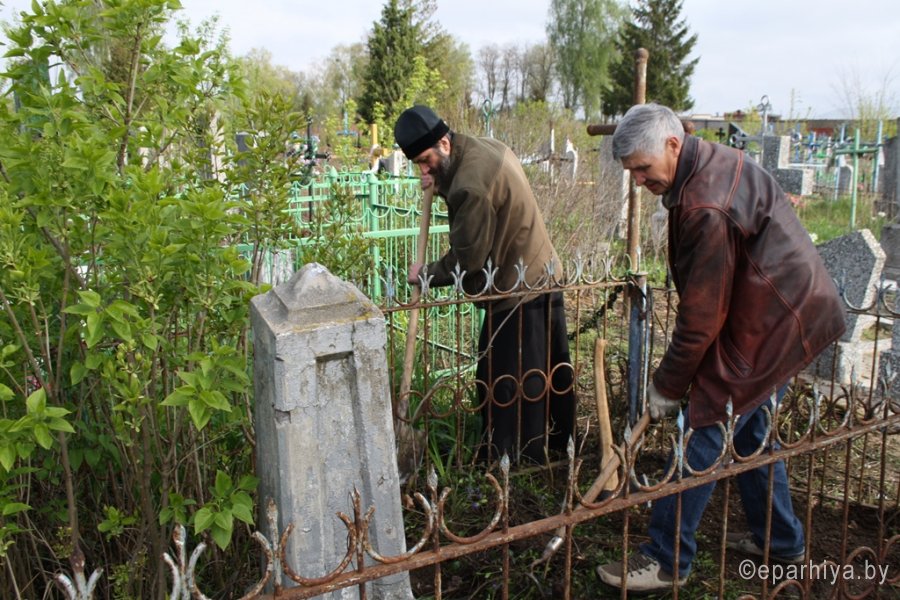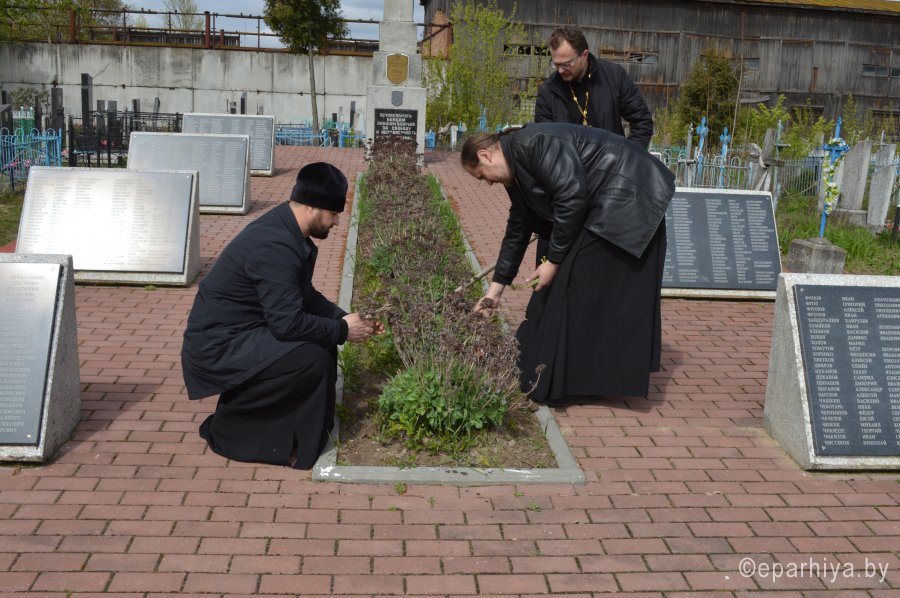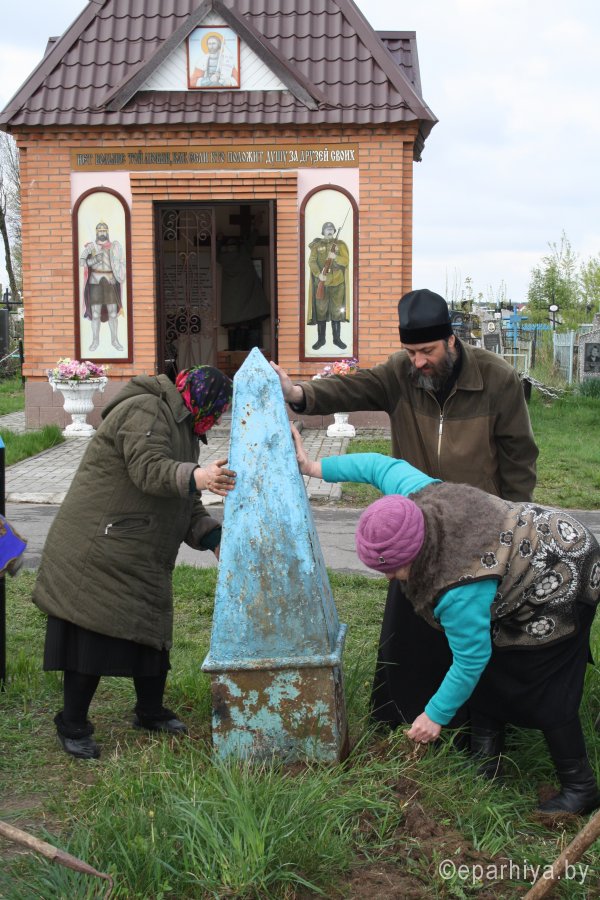 В преддверии Пасхи Христовой на приходах Речицкого благочиния проходят мероприятия по наведению должного порядка на кладбищах - в местах захоронения воинов, погибших в годы Великой Отечественной войны. Совместно с коллективами школ и сельпоселкомов принимают участие в этом душеполезном деле прихожане и священнослужители Речицкого округа. И может быть главное в этих мероприятиях даже не то, что облагораживаются могилы, а то, что в совместном труде люди прикасаются к нашей истории и это остаётся в памяти, а значит связь поколений не прерывается. |